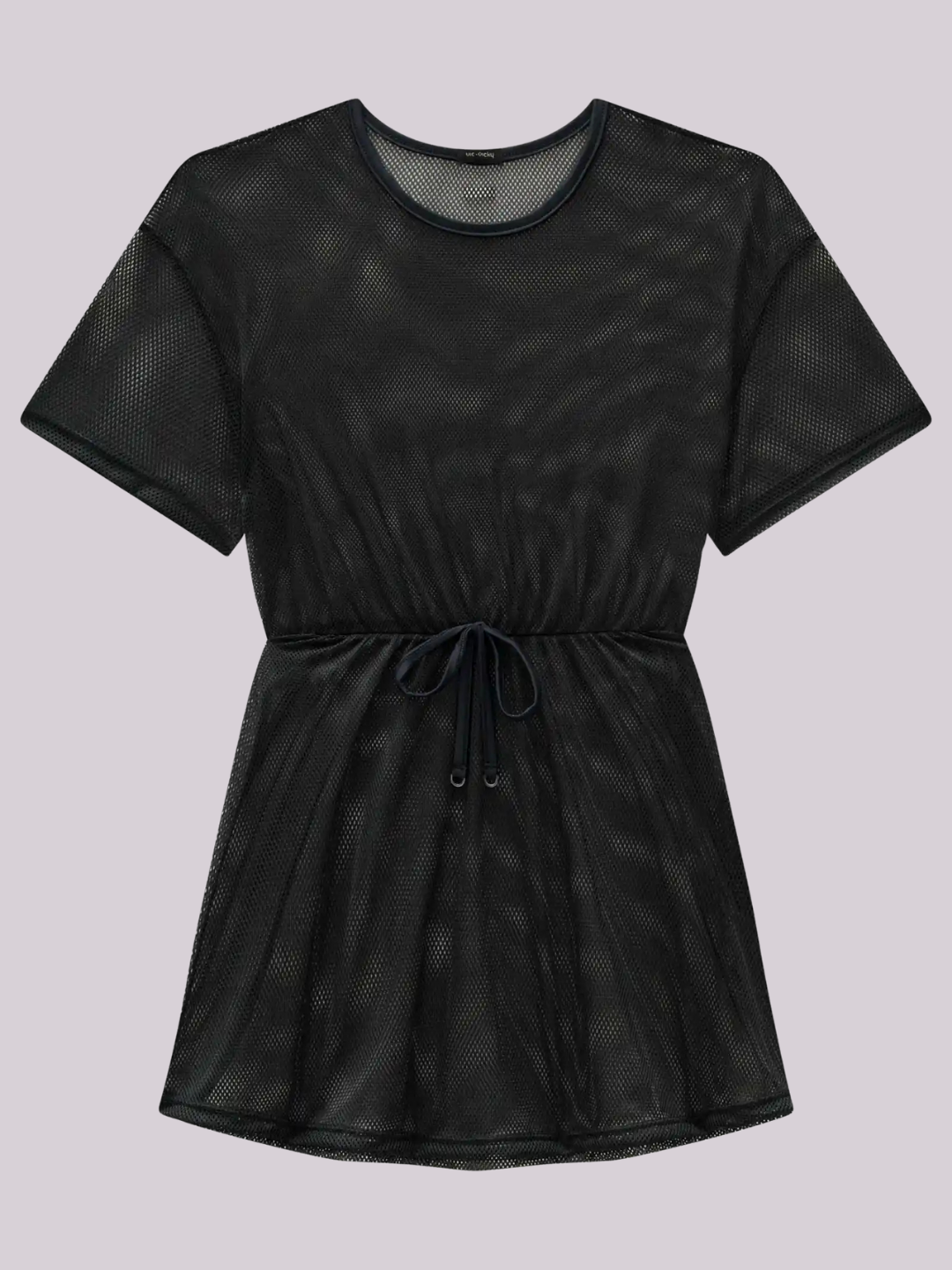 Saída de praia estilosa em tela preta, com caimento soltinho e toque moderno – perfeita para dias de sol com muito conforto.