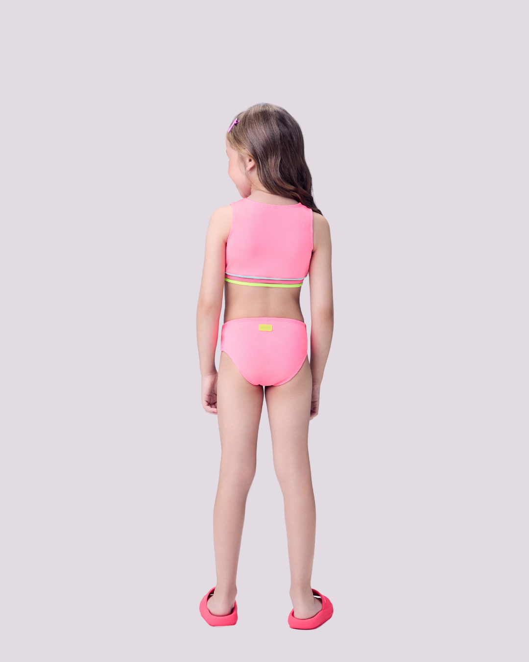 Biquíni infantil Momi rosa neon com top cropped, faixa colorida e aplique de smile. Acompanha calcinha confortável. Estiloso e alegre para o verão das pequenas.