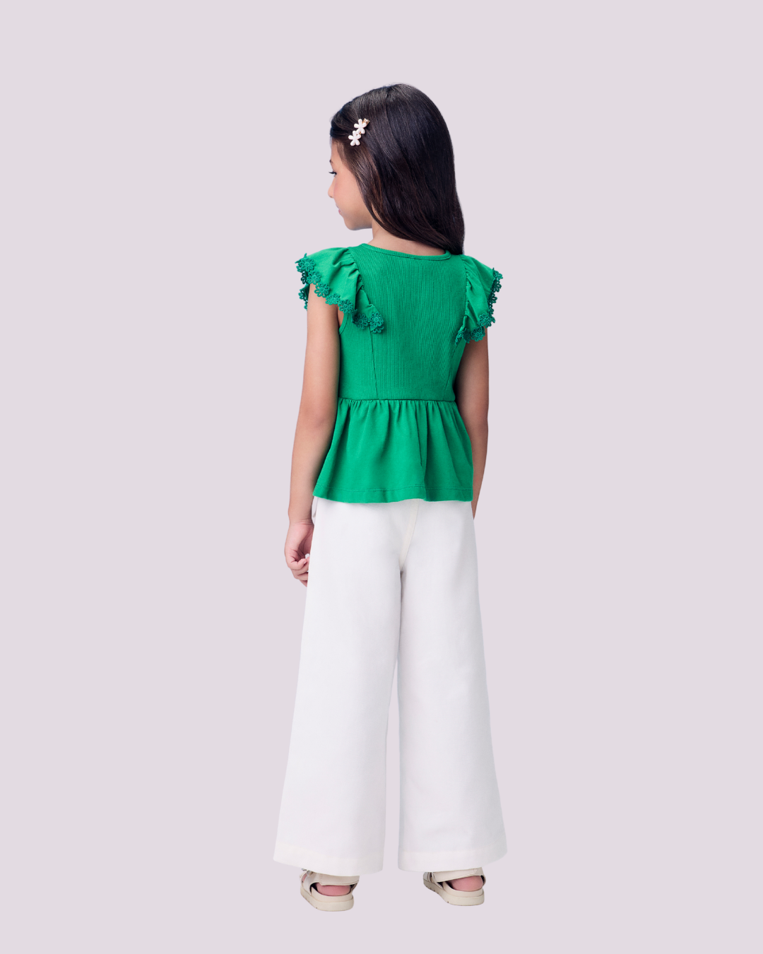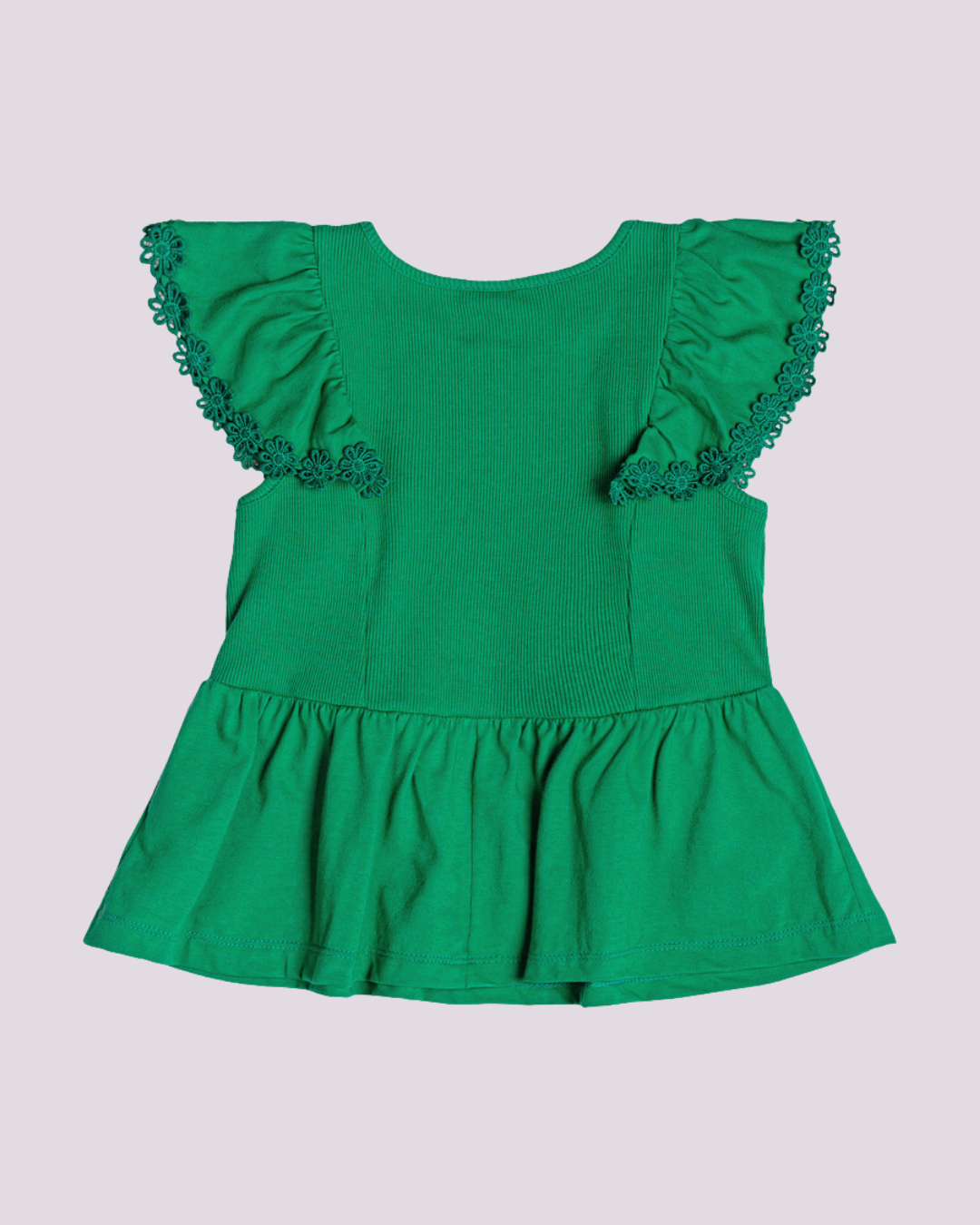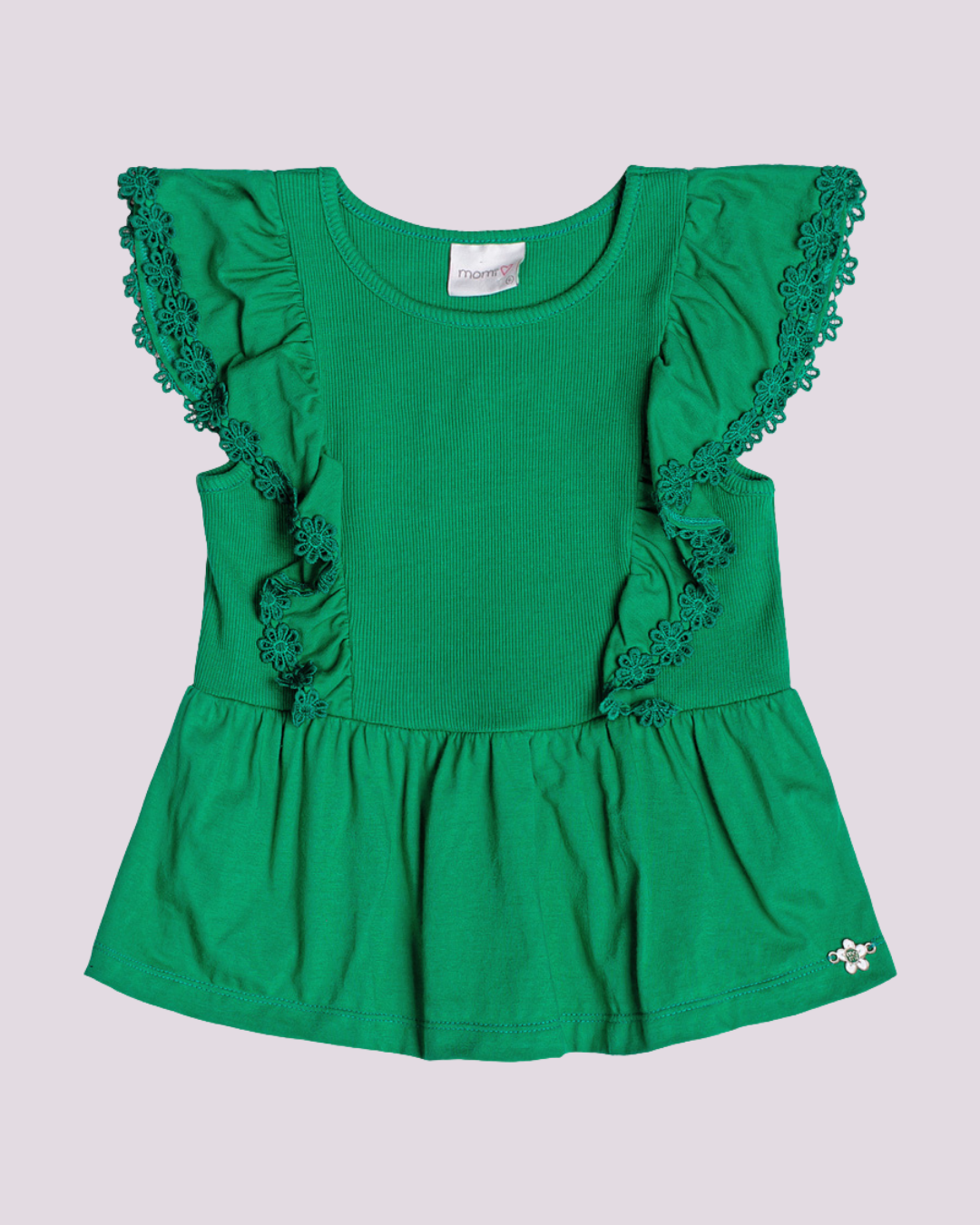 Blusa verde Momi com babados e renda floral – delicadeza e estilo em uma peça cheia de charme.