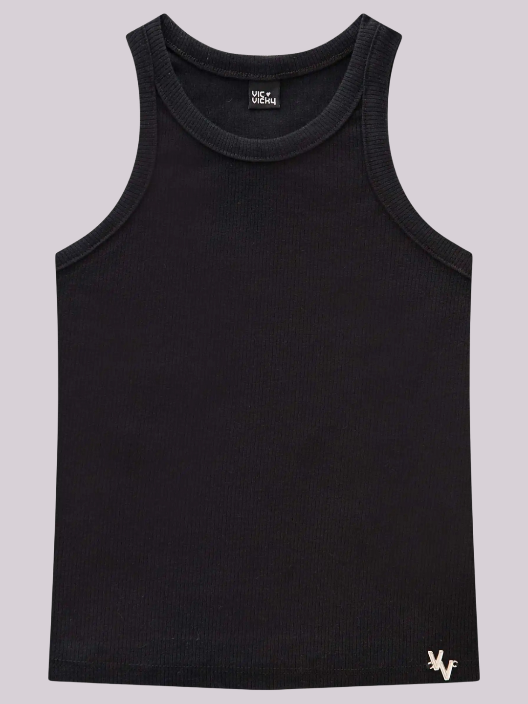 Regata preta em malha canelada, com modelagem justinha e acabamento reforçado nas cavas e gola. Possui aplique metálico Vic Vicky na barra, trazendo aquele toque moderno e versátil que combina com qualquer look — do básico ao mais arrumadinho.