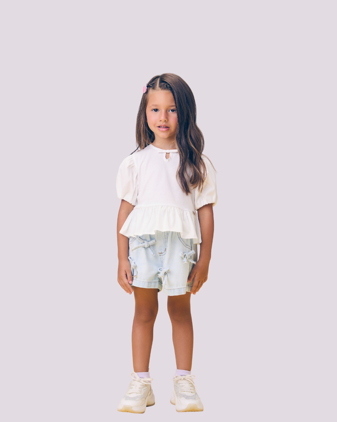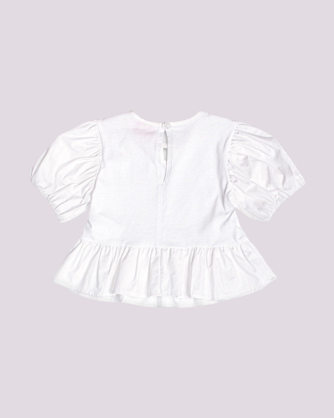 Blusa infantil branca com design delicado, trazendo mangas bufantes e detalhe em babado na barra, que adiciona movimento e charme ao visual. Possui fechamento discreto nas costas com lacinho, garantindo praticidade no vestir. Uma peça versátil para composições modernas e românticas, perfeita para diferentes ocasiões.