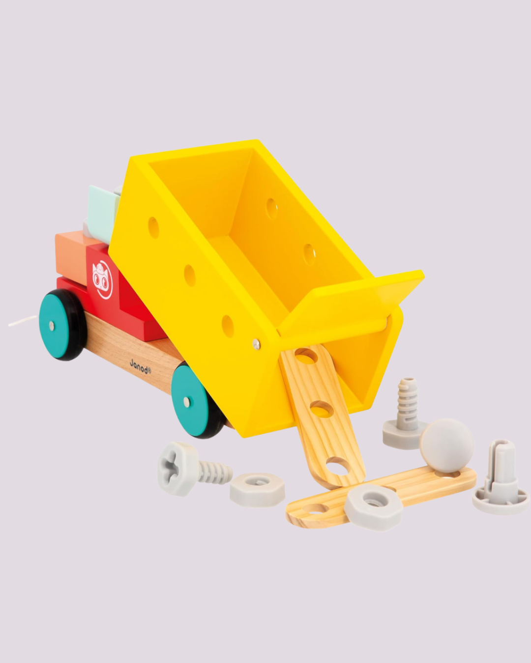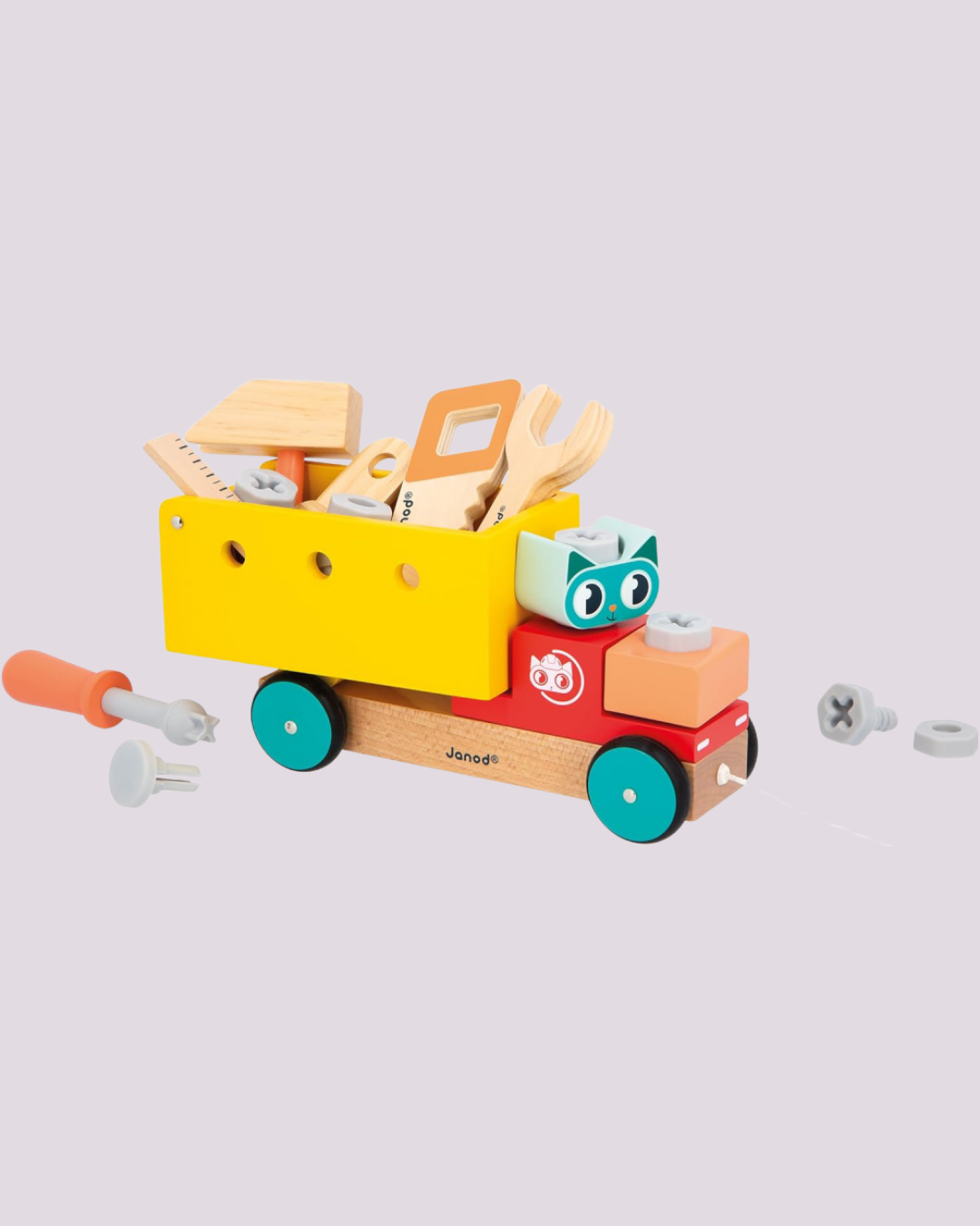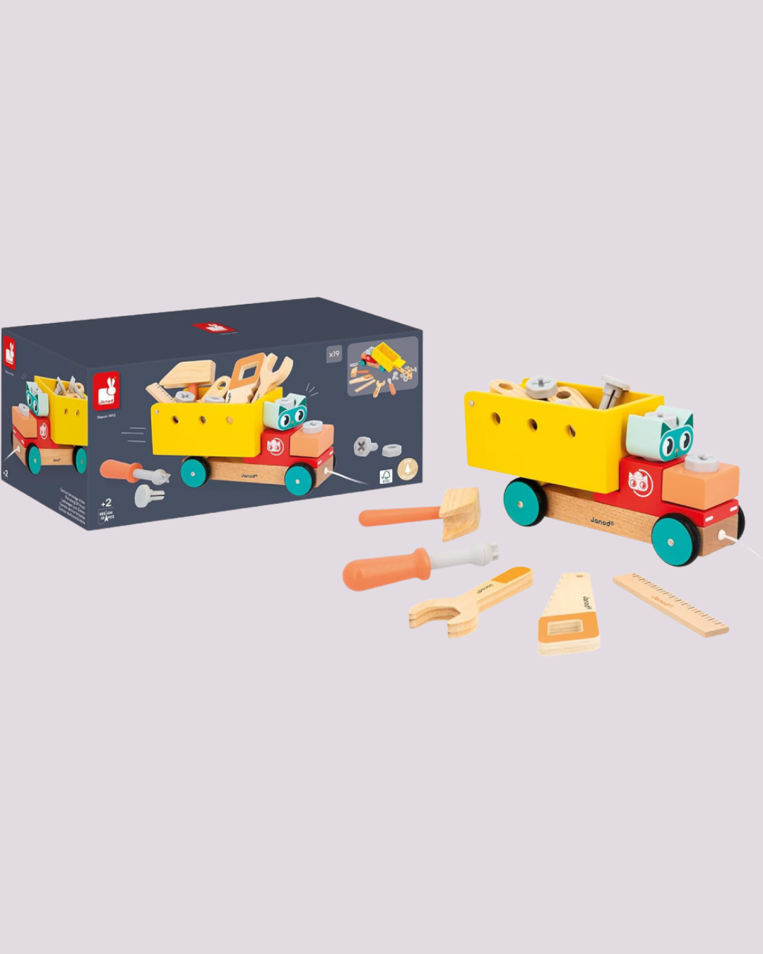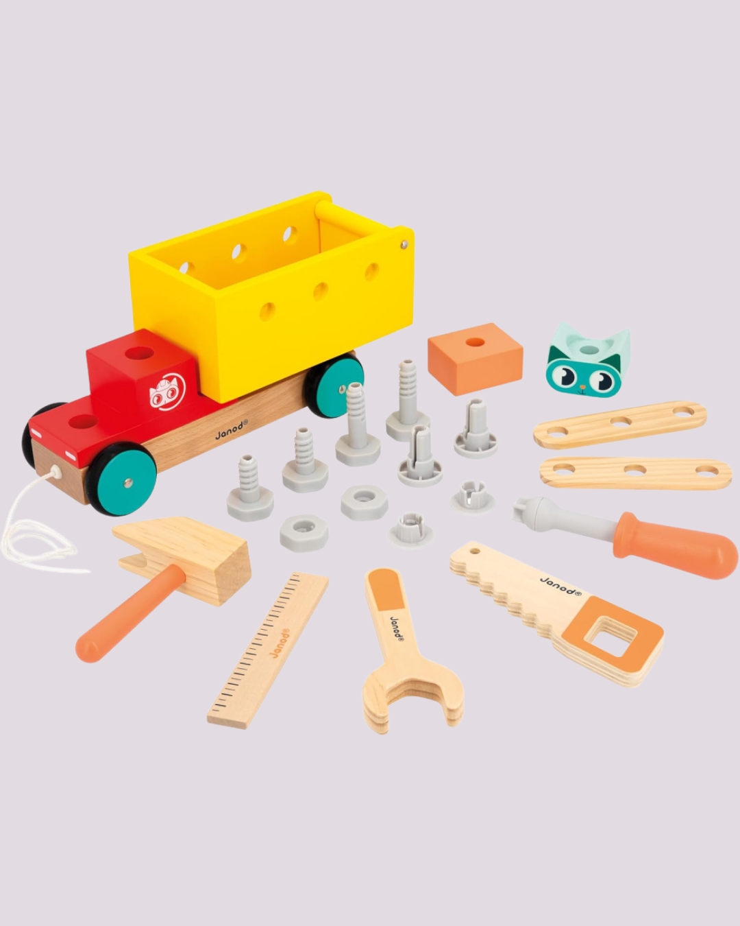 Caminhão oficina em madeira com ferramentas e peças de montar, ideal para estimular criatividade e habilidades manuais – Janod.
