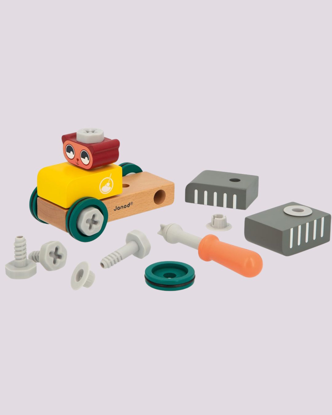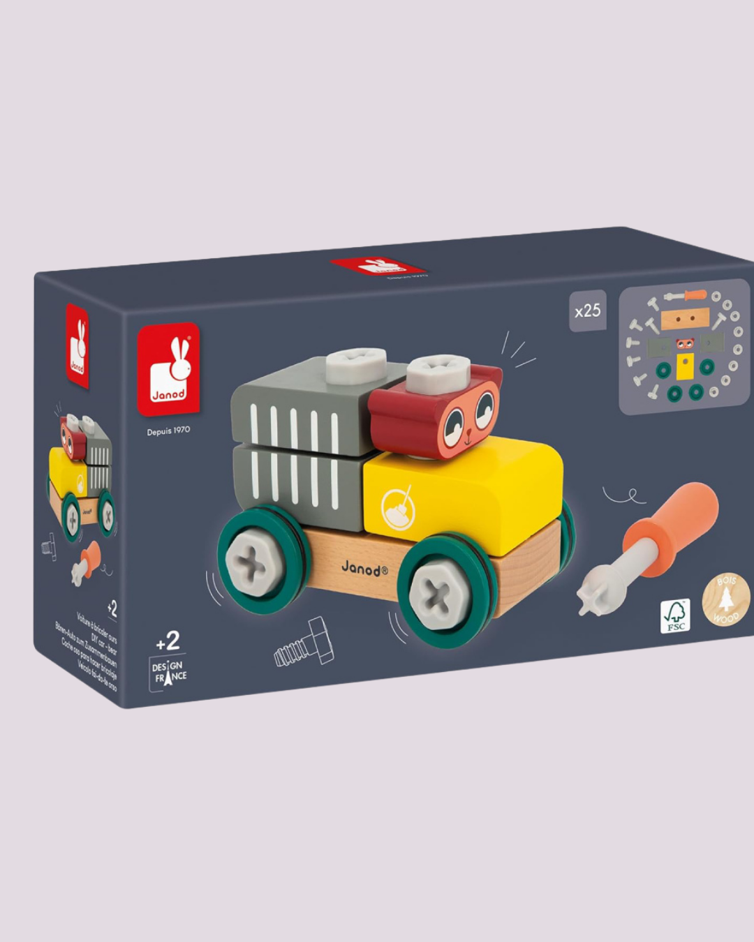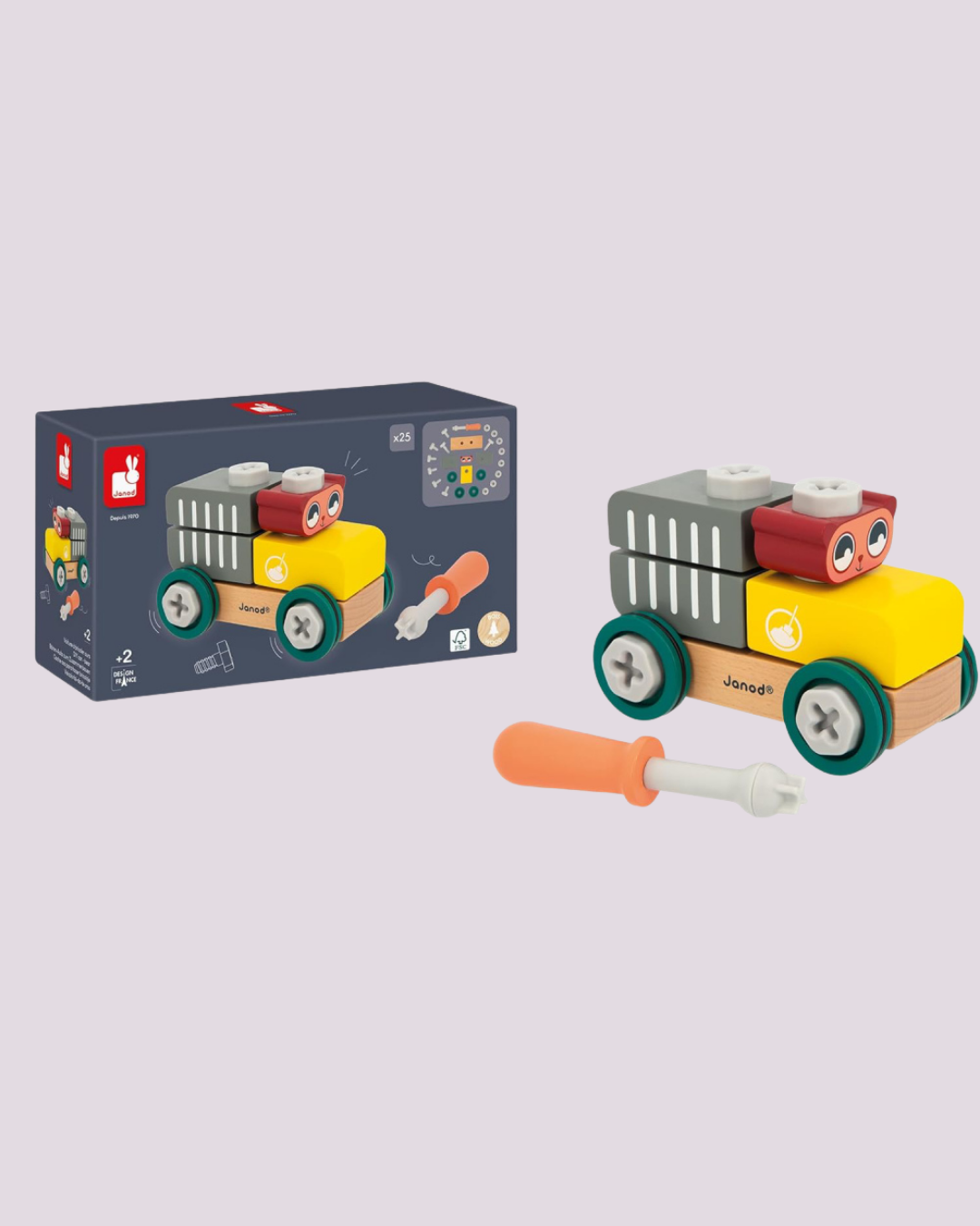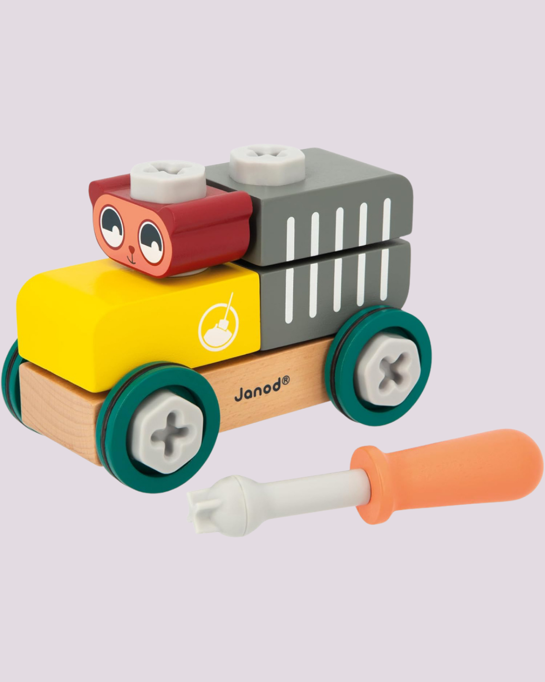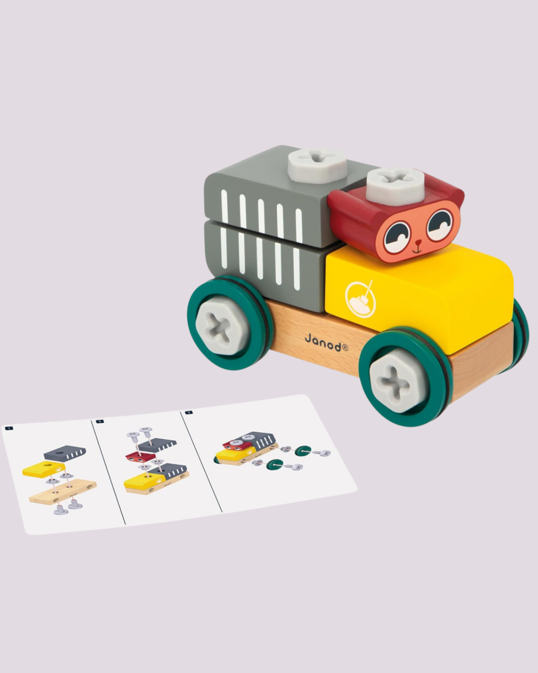 Caminhão de construção em madeira com blocos coloridos para montar e criar diferentes combinações – Janod.