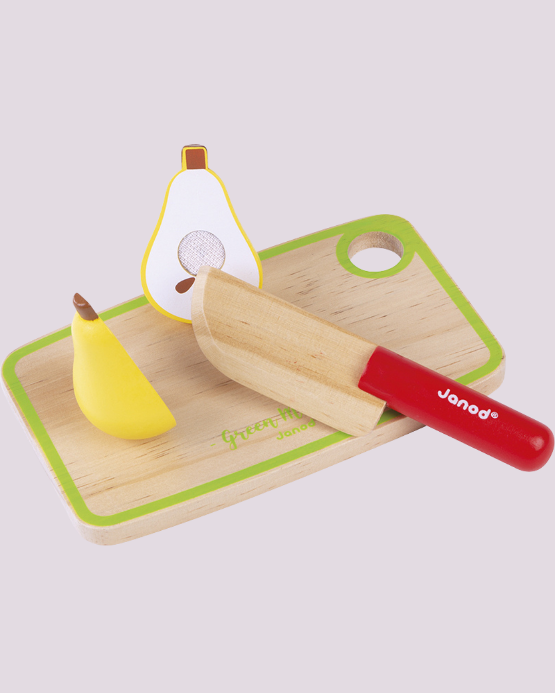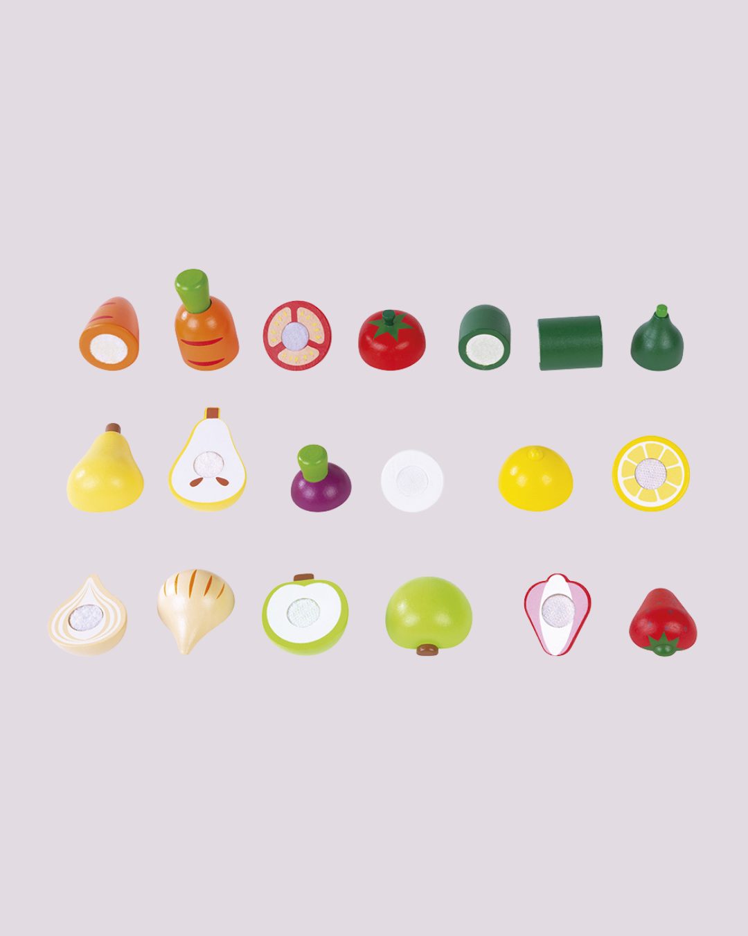 Caixa de legumes em madeira com peças que se cortam ao meio, estimulando o faz de conta e a alimentação saudável – Janod.