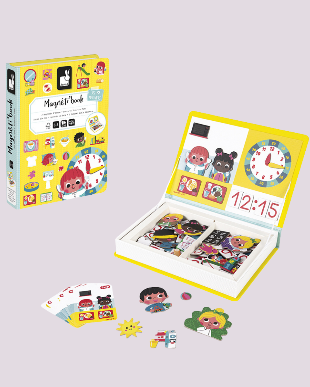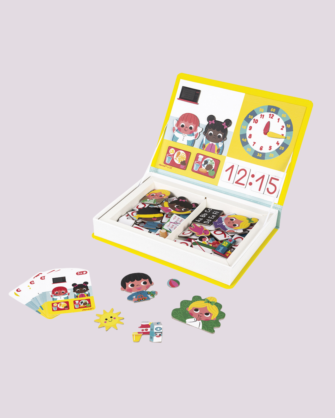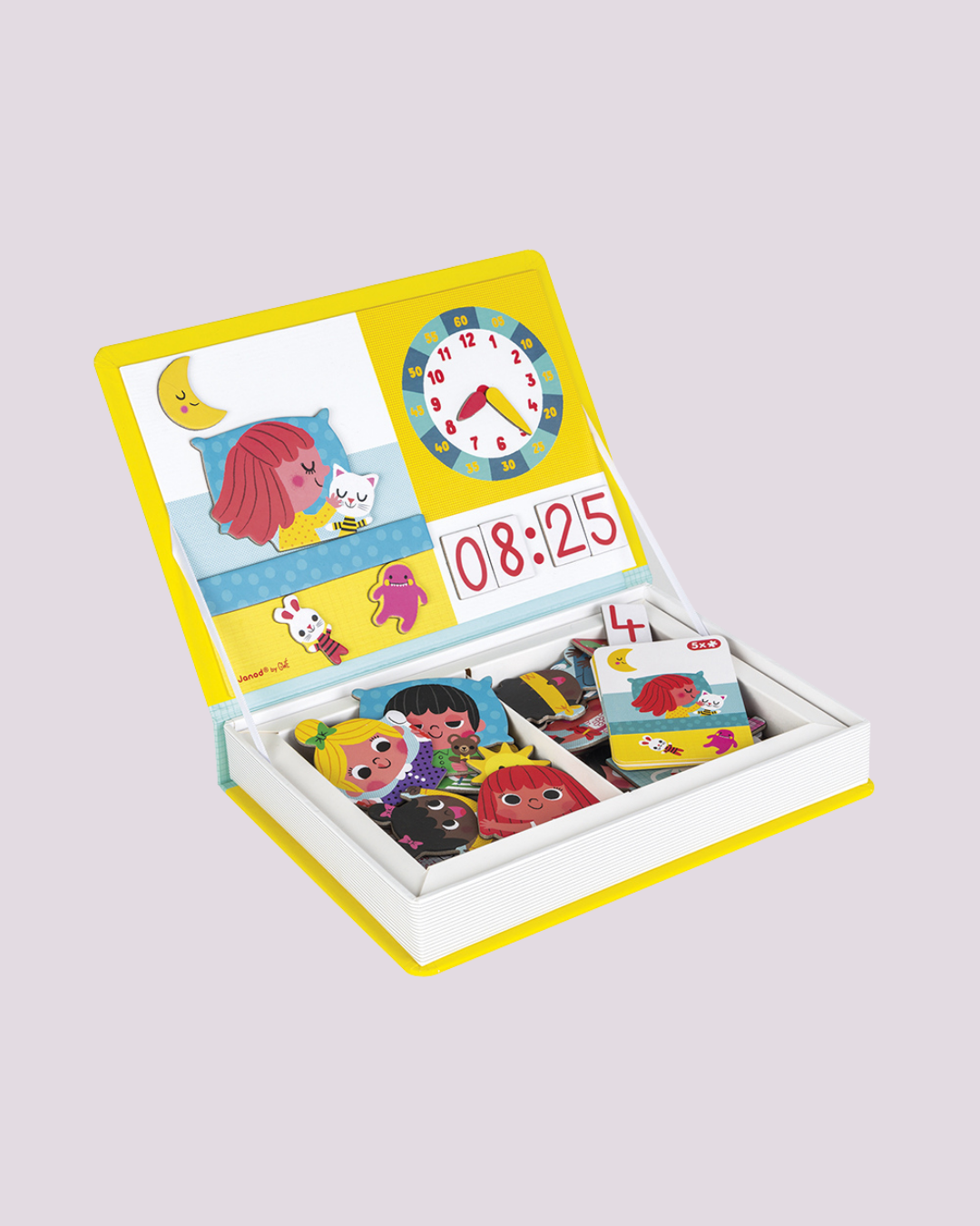 Livro magnético com 75 peças que ensina a rotina diária e a noção do tempo de forma divertida – Janod.