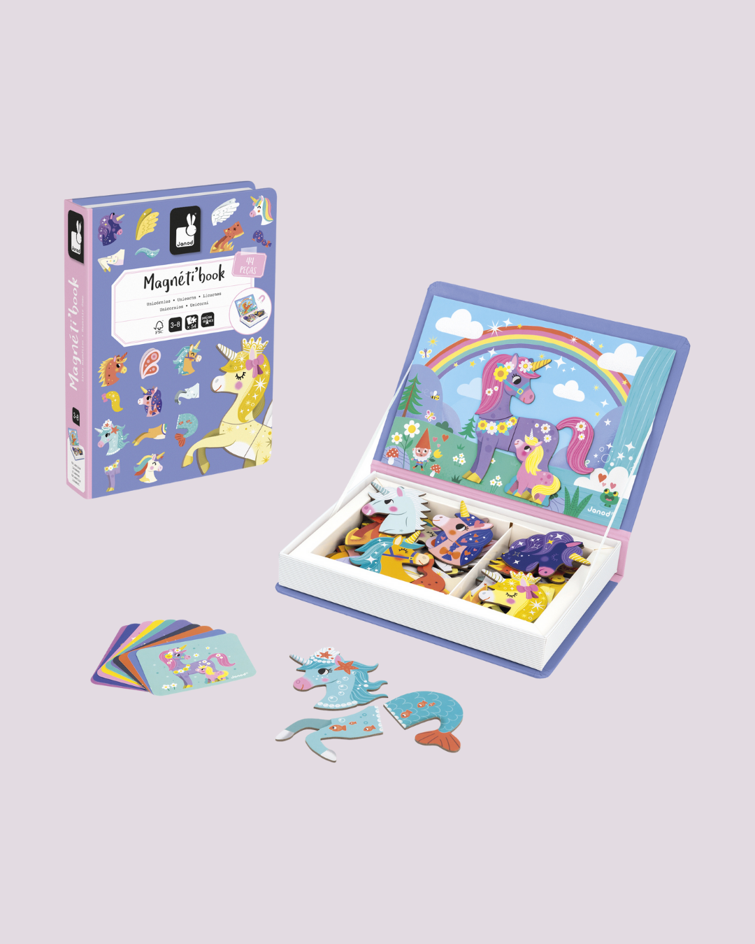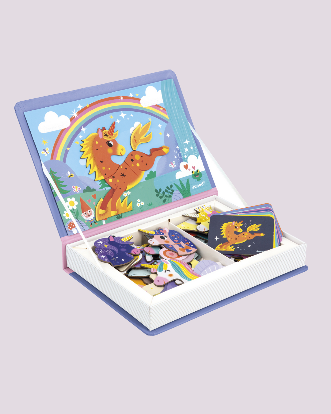 Livro magnético com 44 peças para criar e combinar unicórnios encantados, cheio de cor e imaginação – Janod.