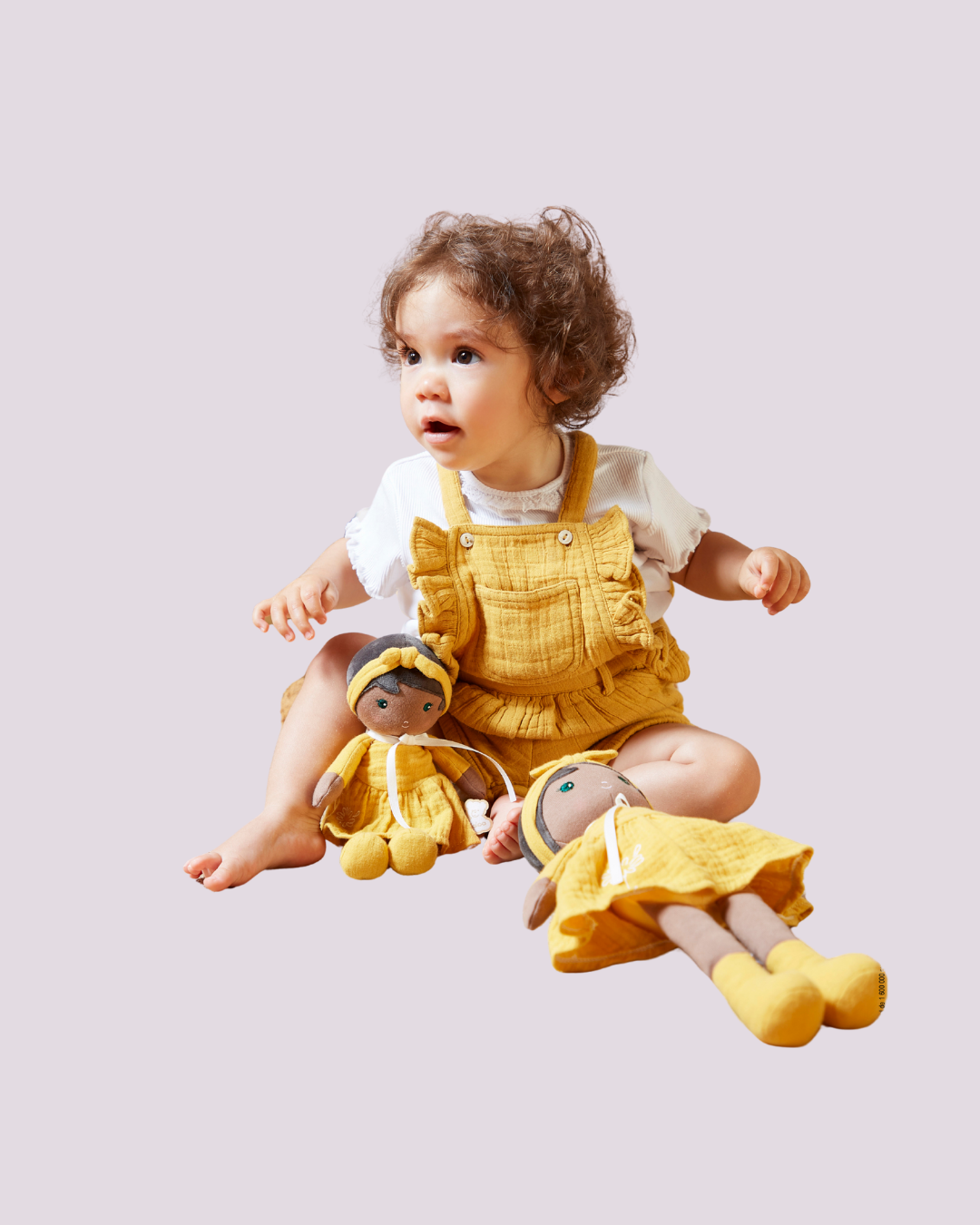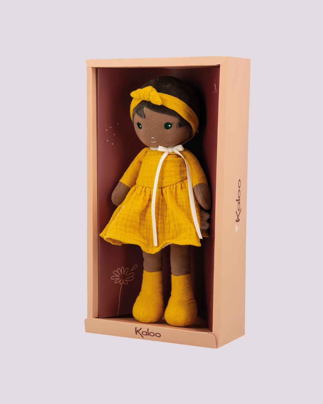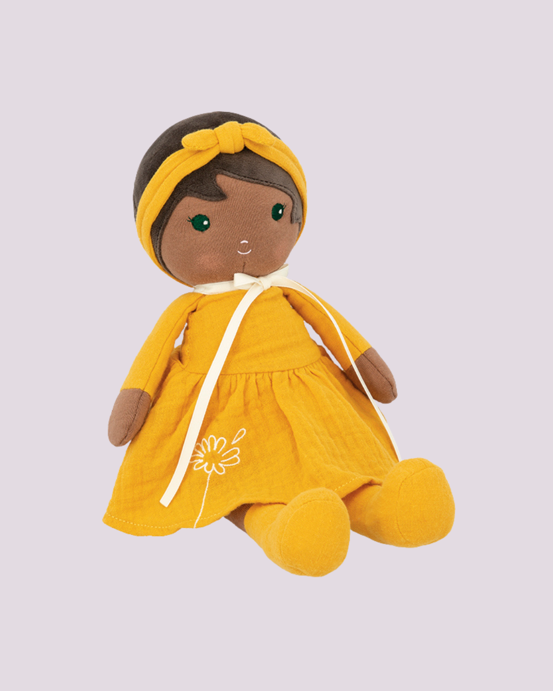 Boneca de pano com vestido amarelo, delicada e aconchegante, perfeita para presentear – Kaloo.