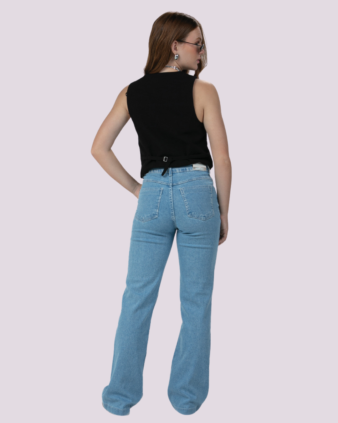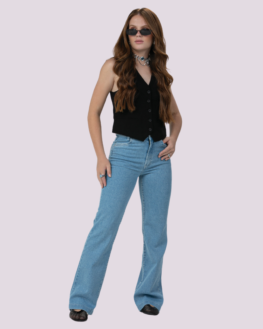 Calça jeans flare feminina azul clara, moderna e estilosa para compor looks versáteis – Sun Place.
