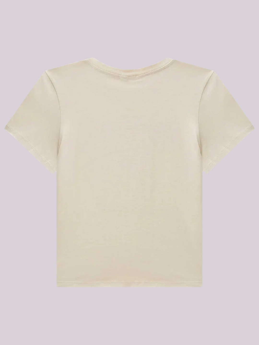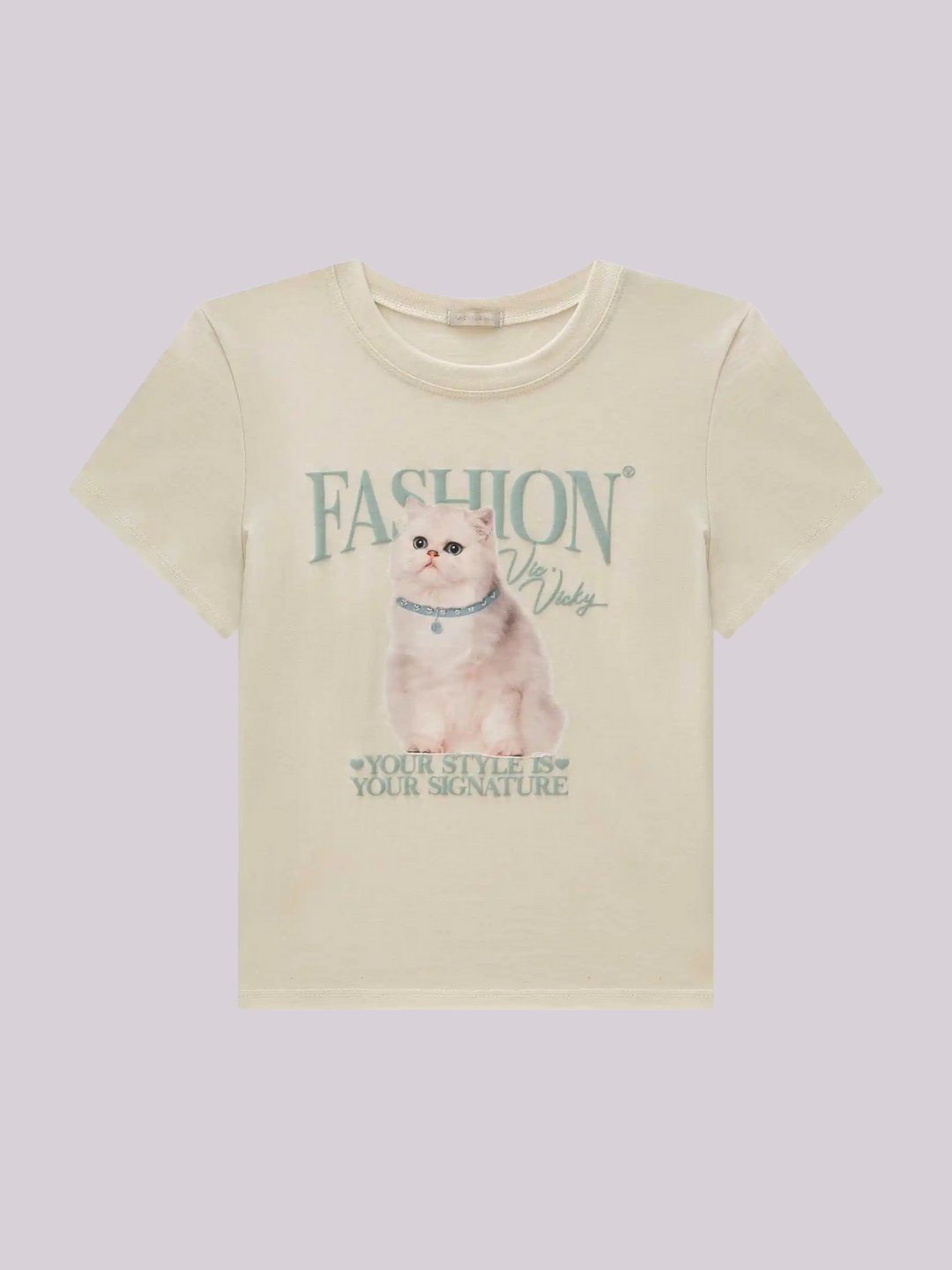 T-shirt delicada com estampa de gatinho e frase fashion — perfeita para looks modernos e confortáveis.