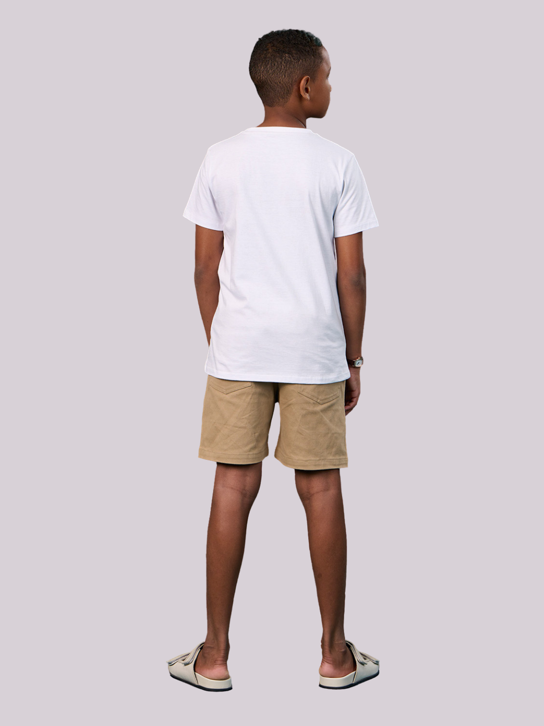 Camiseta branca infantil com estampa minimalista “OK & Friends”, confeccionada em malha confortável e perfeita para compor looks leves e modernos.
