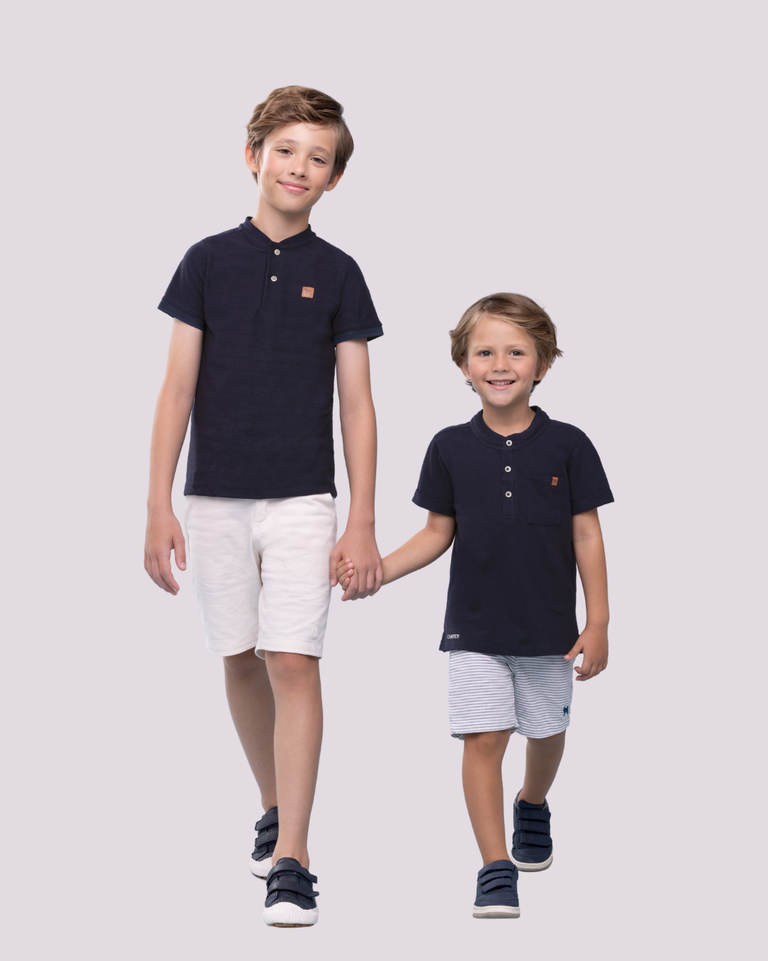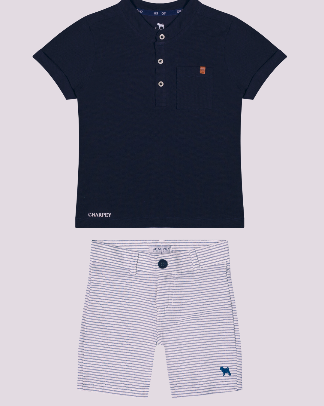 Conjunto Charpey azul marinho e branco — estilo clássico e conforto premium para os pequenos com o toque sofisticado da marca