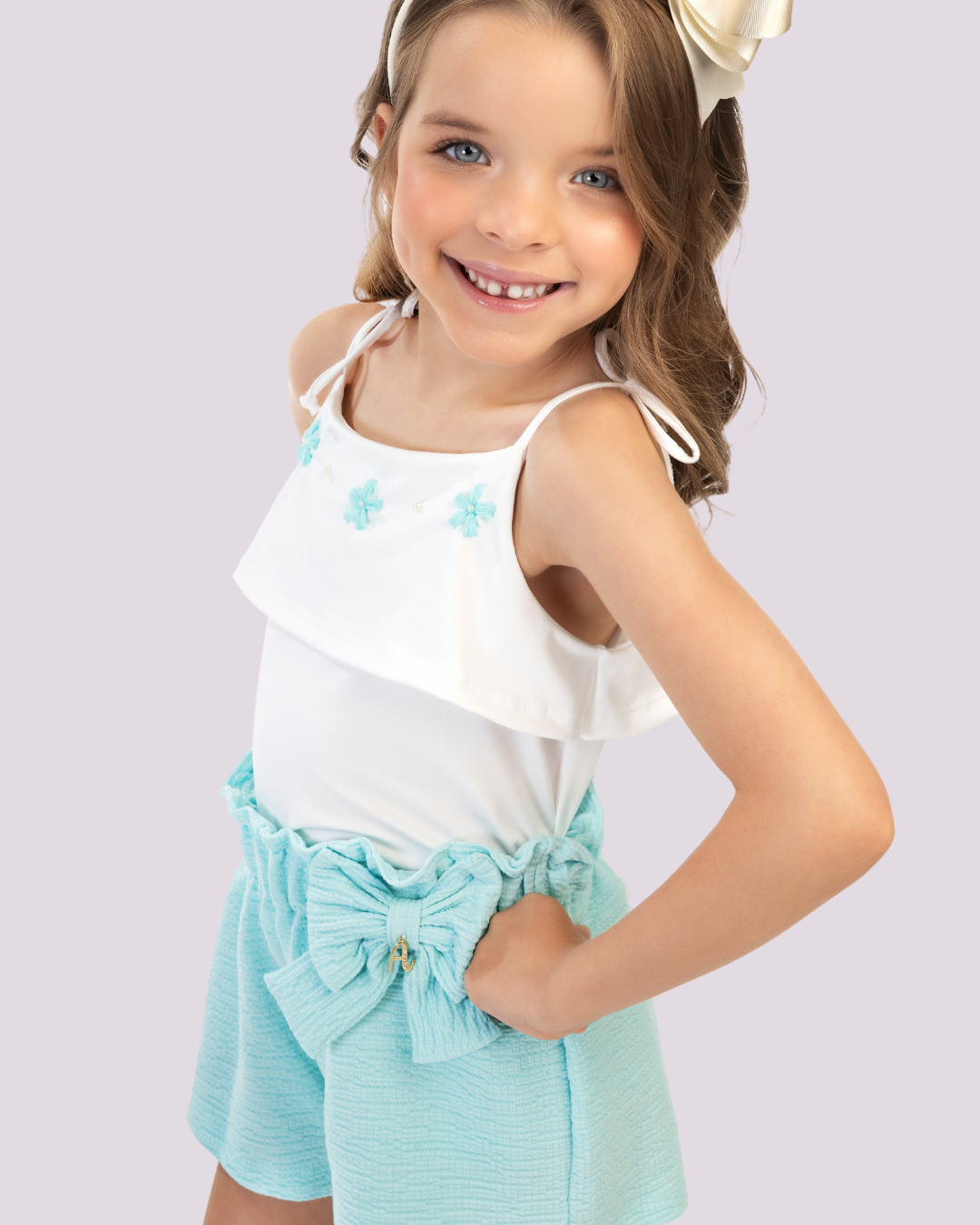 Conjunto bata com detalhes manuais e shorts com laço decorativo, perfeito para looks frescos e charmosos.