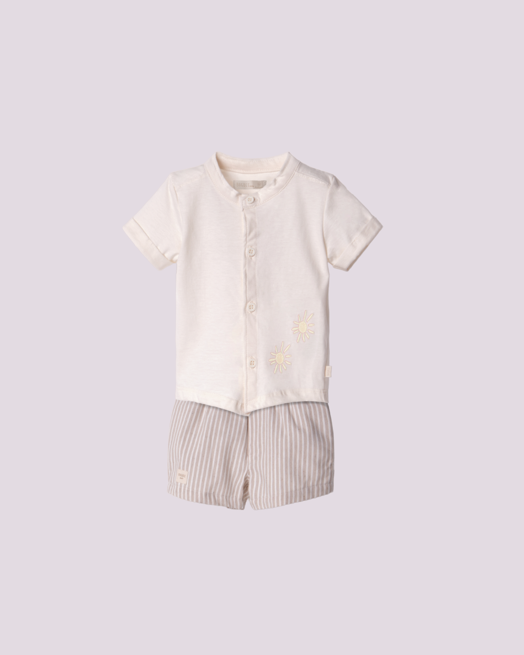 Conjunto baby masculino Bugbee com camiseta de botões e short listrado, prático e confortável para o dia a dia.