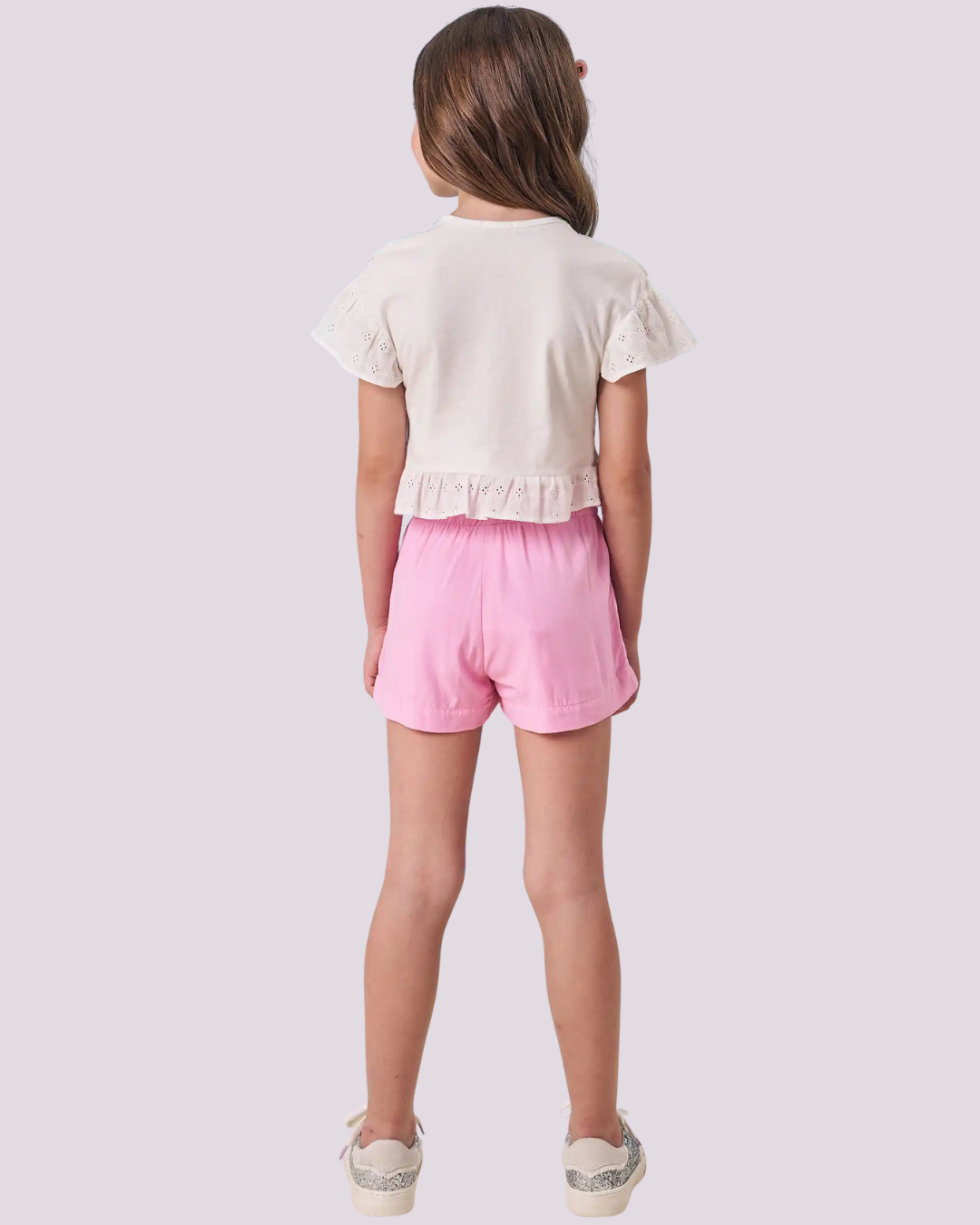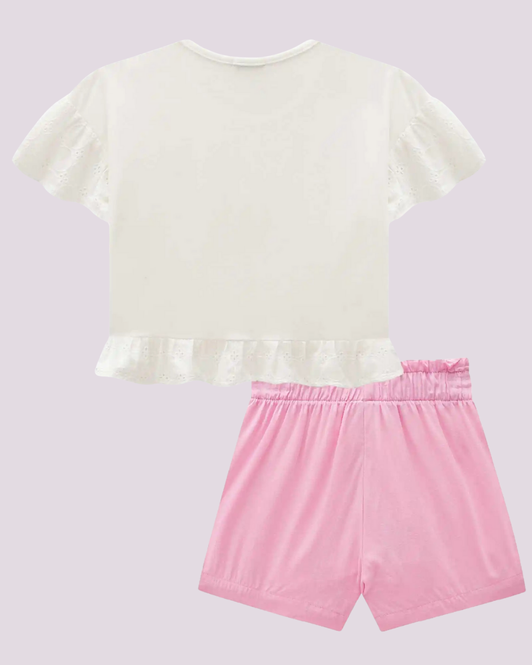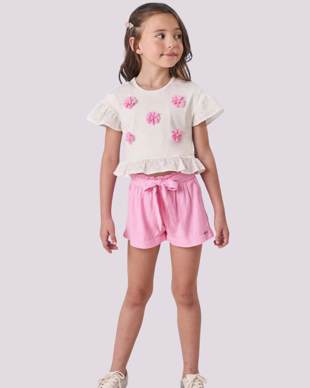 Um look encantador que une conforto e delicadeza! O Conjunto Flores 3D da Infanti traz uma blusa off white com mangas bordadas e apliques de flores com pérolas, combinada com shorts rosa de cintura alta e faixa para amarração. Um visual leve e cheio de personalidade para os dias ensolarados!