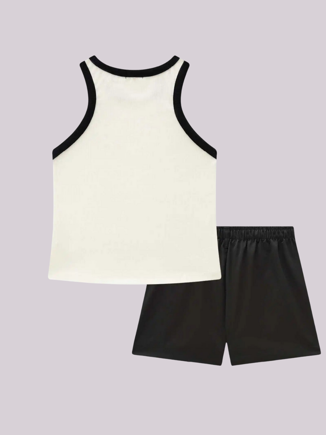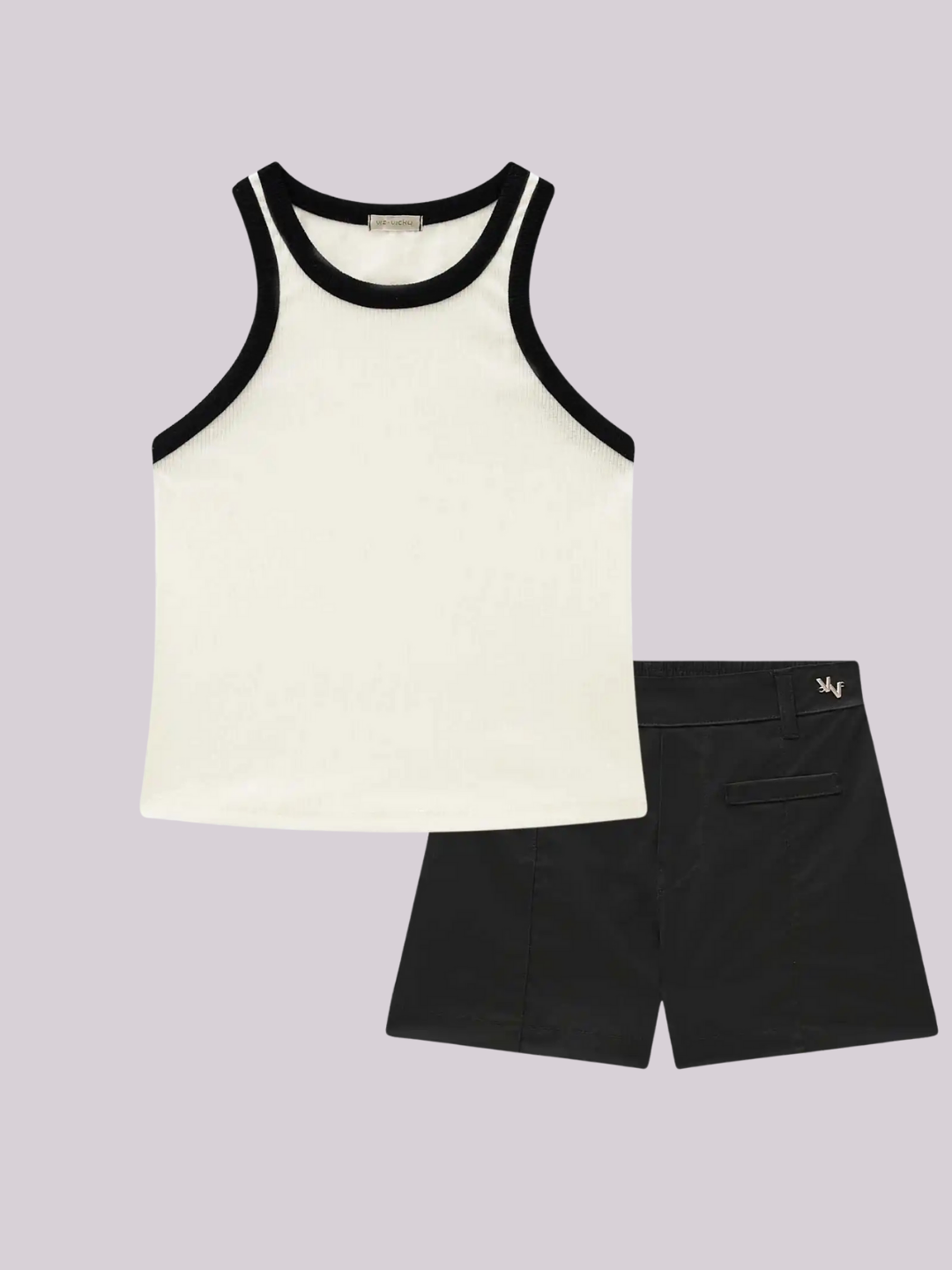 Conjunto estiloso com regata off-white detalhada em preto e shorts preto de cintura alta. Moderno, confortável e perfeito para o dia a dia.