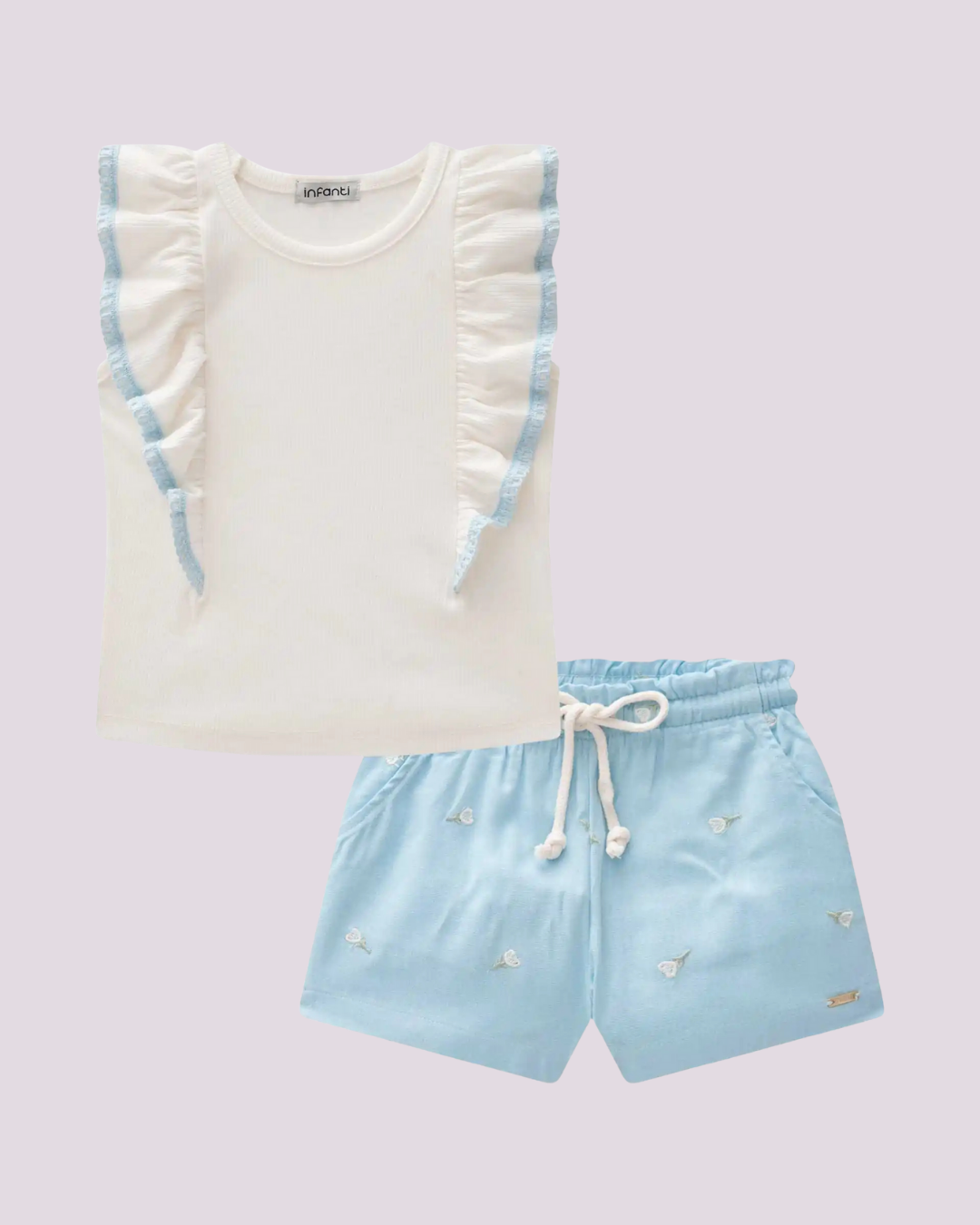 O conjunto Off White e Azul da Infanti é a escolha perfeita para looks delicados e cheios de charme. A blusa em malha canelada traz babadinhos nas laterais com acabamento em azul, enquanto o shorts em tecido leve possui bordados florais sutis e cordão ajustável na cintura. Um visual leve, confortável e encantador para o dia a dia das pequenas!