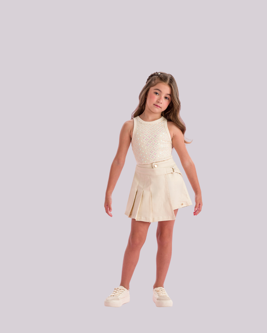 Conjunto Petit Cherry com blusa brilhante e saia plissada com cinto — delicado, moderno e cheio de charme.