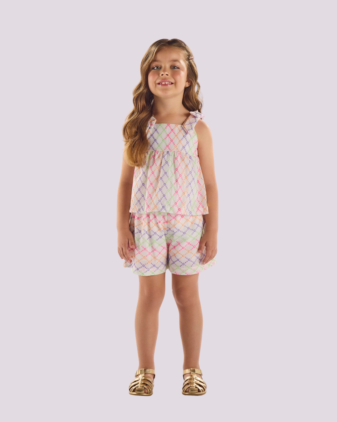Conjunto Infantil Feminino Estampado — leveza e alegria em cada detalhe Um look cheio de charme e conforto! O conjunto traz blusinha de alças com babadinhos e shorts soltinho com estampa delicada em tons pastel. Ideal para dias ensolarados e momentos de diversão, combinando frescor e estilo com um toque romântico.