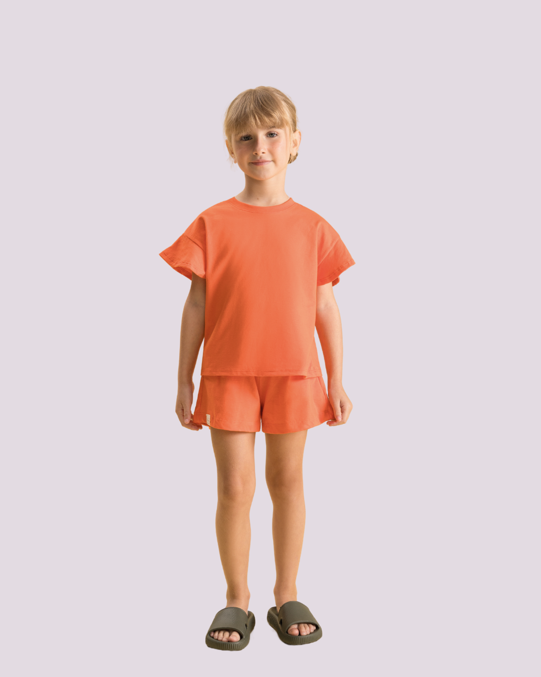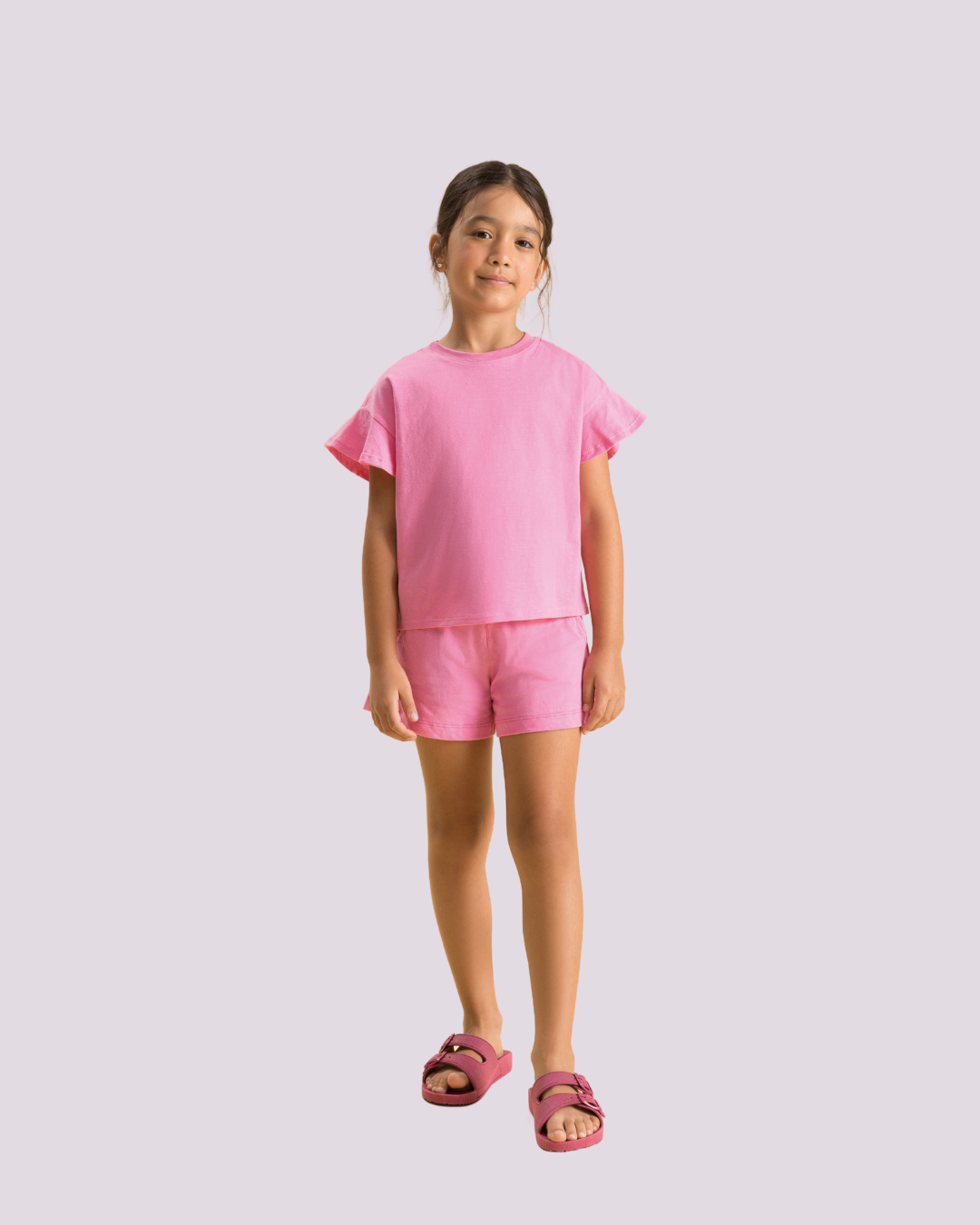 Conjunto infantil Bugbee composto por camiseta com detalhe de babado nas mangas e short confortável de cintura elástica. Uma proposta prática e cheia de estilo para o dia a dia das pequenas, garantindo liberdade de movimento e um visual moderno.