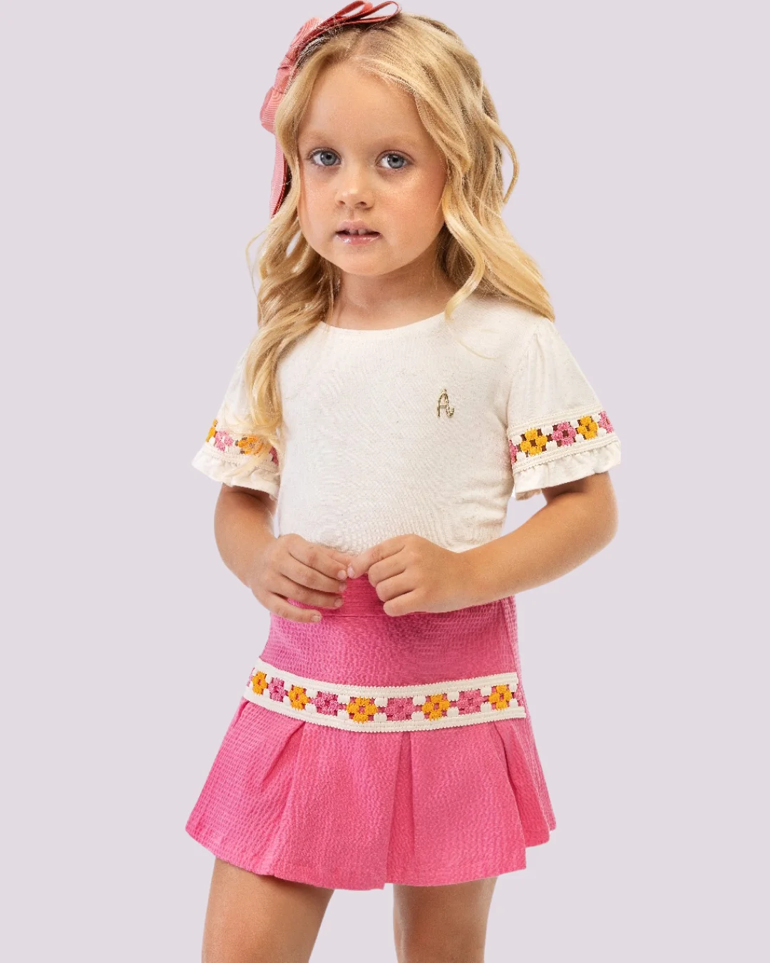 Conjunto infantil feminino da Ale Kids, composto por blusa off white com bordado colorido nas mangas e saia rosa com detalhe de faixa bordada na cintura. A blusa tem modelagem leve e delicada, enquanto a saia traz recortes que garantem movimento e charme. Um look alegre e confortável para as pequenas brilharem em qualquer ocasião.