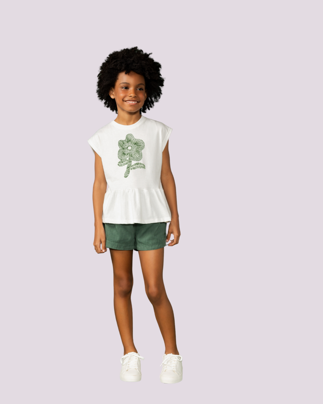 Conjunto Bugbee com blusa estampada e short canelado, feito em algodão responsável — leveza e consciência para o dia a dia.