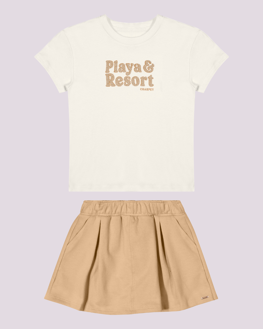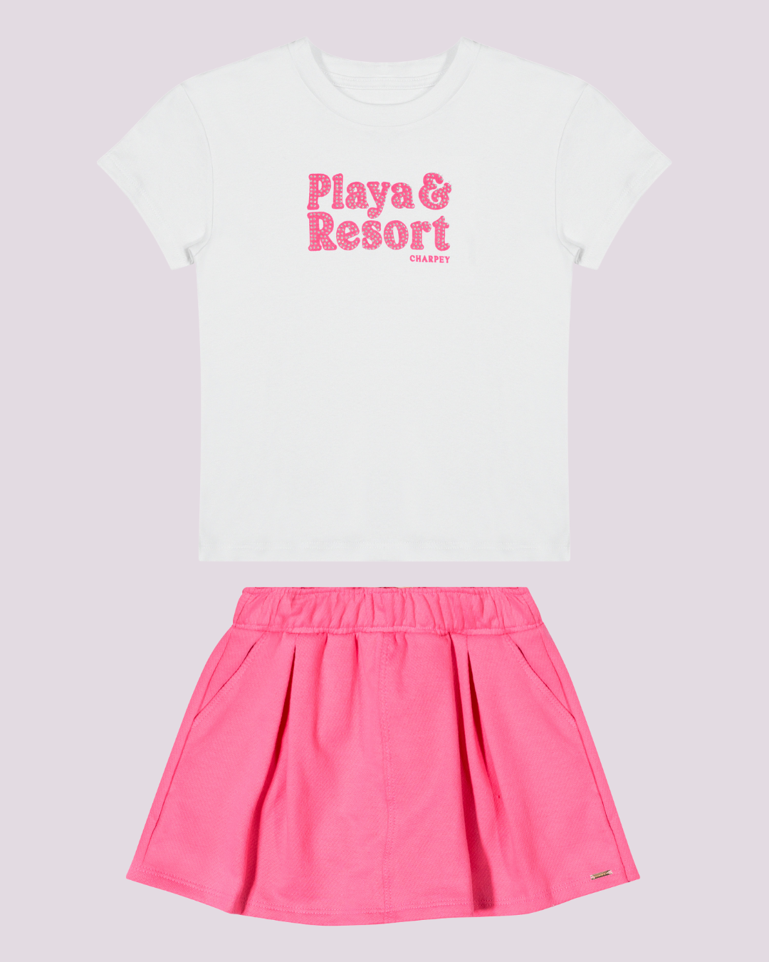 Conjunto infantil com t-shirt estampada e saia rosa em malha leve, cheio de charme e conforto para o dia a dia. Charpey