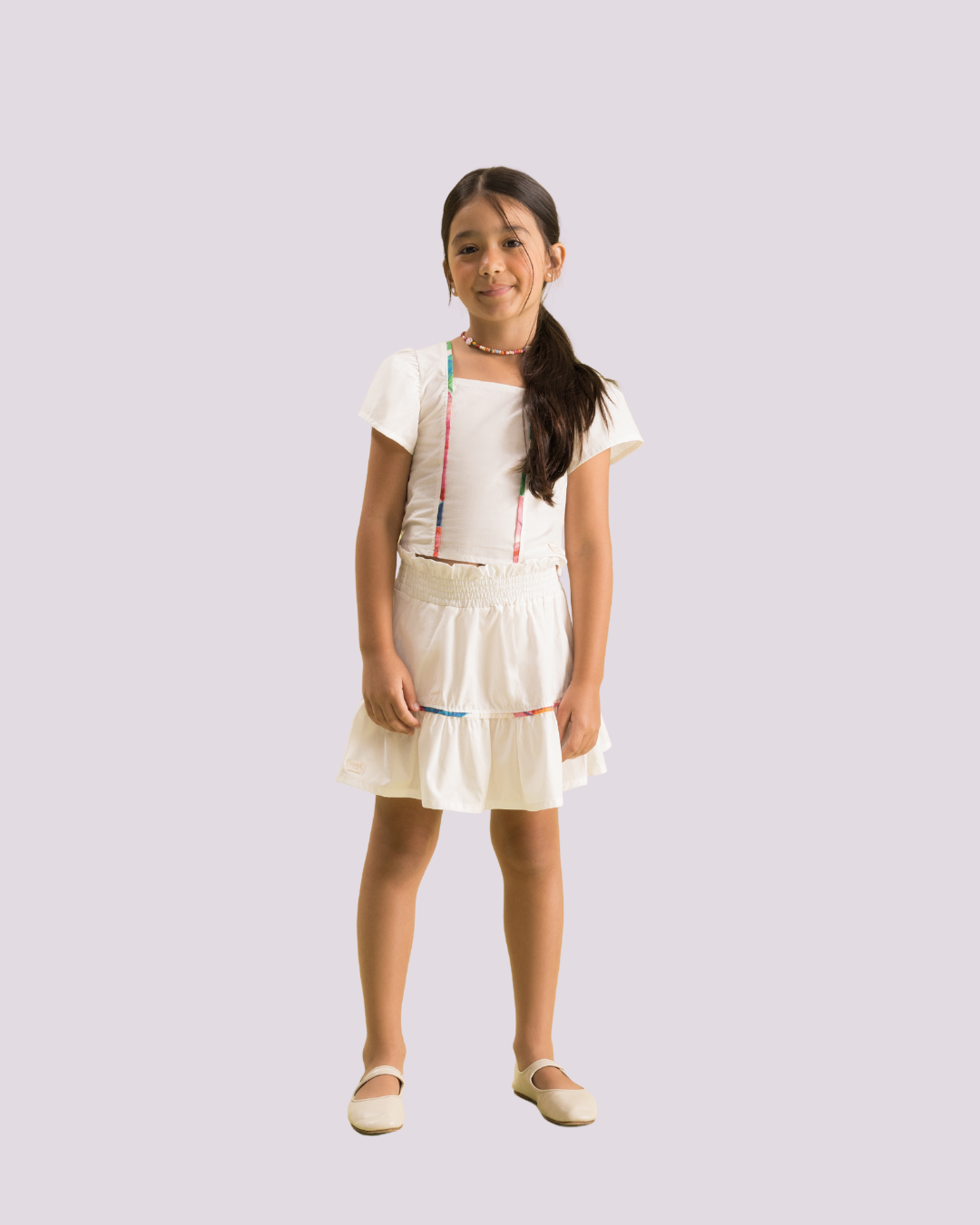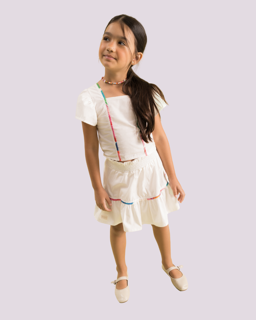 Conjunto feminino Bugbee com cropped e saia curta branca com detalhes coloridos, leve e alegre para o verão.