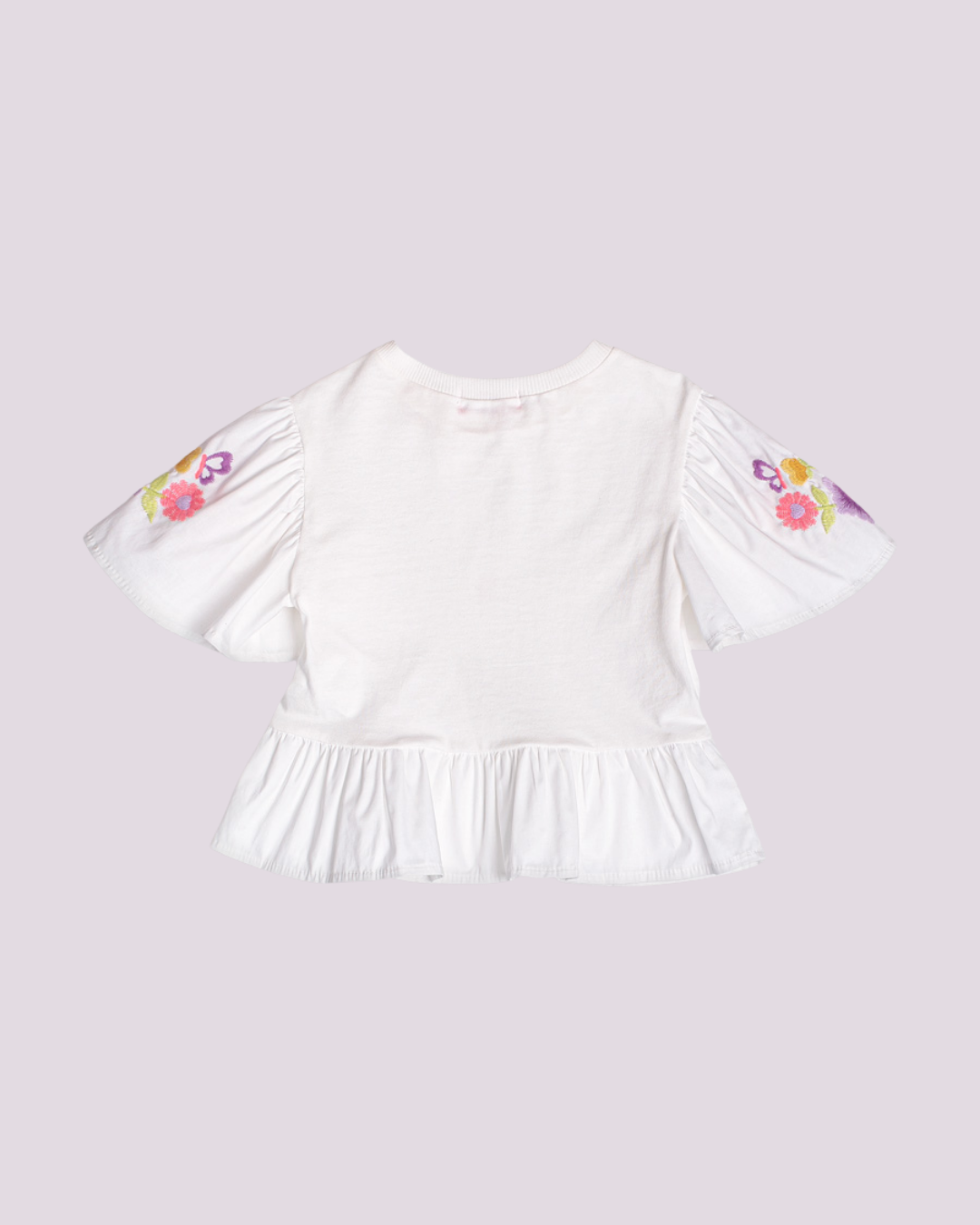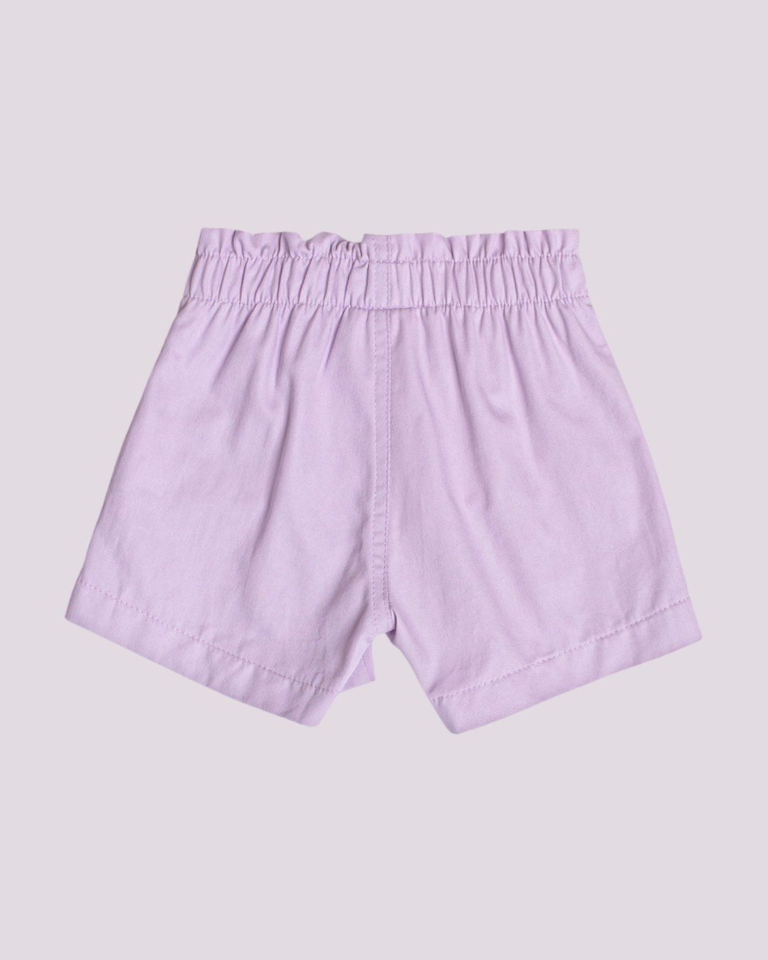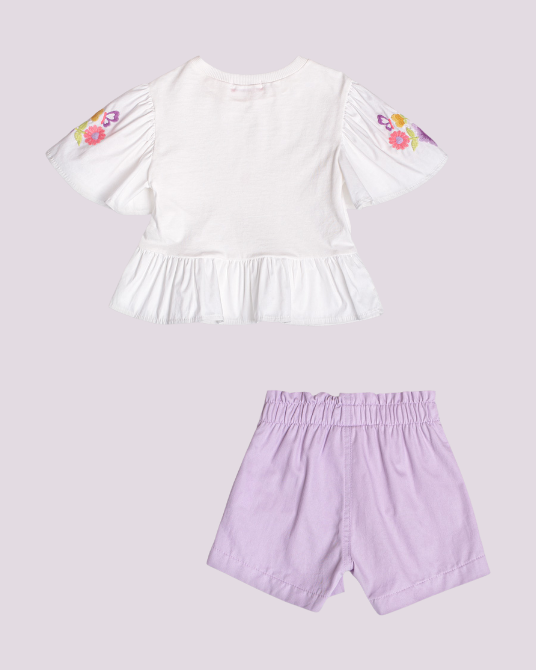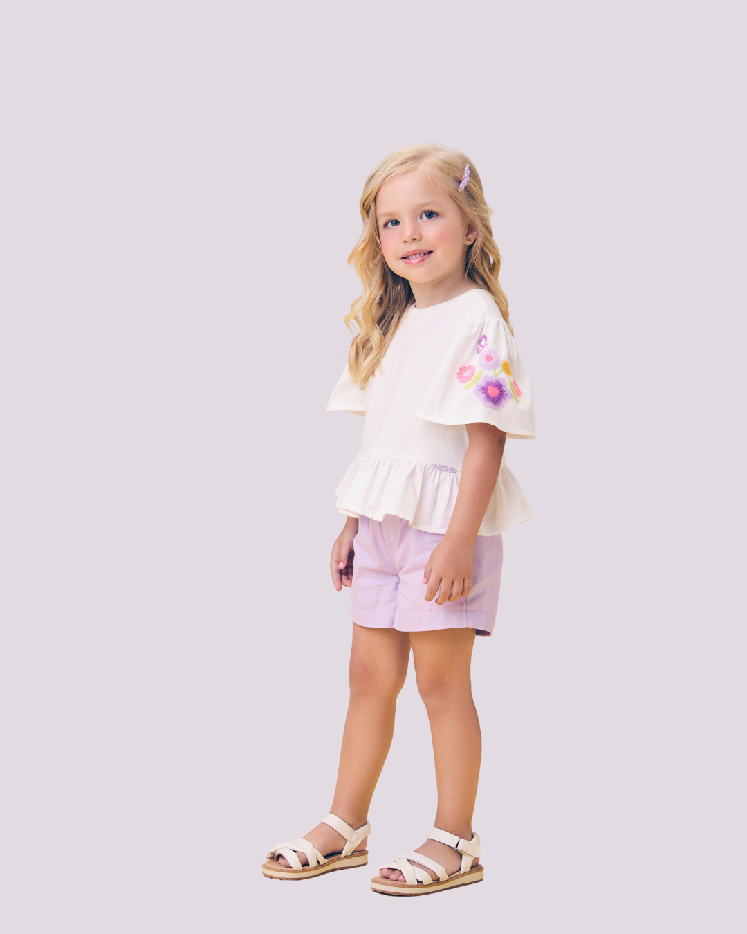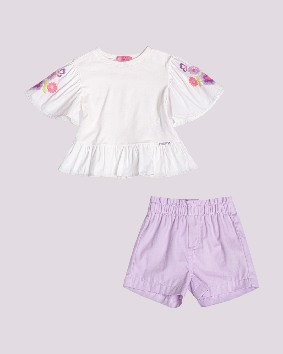 Conjunto infantil composto por blusa branca com babado na barra e mangas amplas, detalhe delicado de bordado floral na manga, acompanhado de shorts lilás com cós confortável. Um look moderno, leve e cheio de charme para qualquer ocasião.