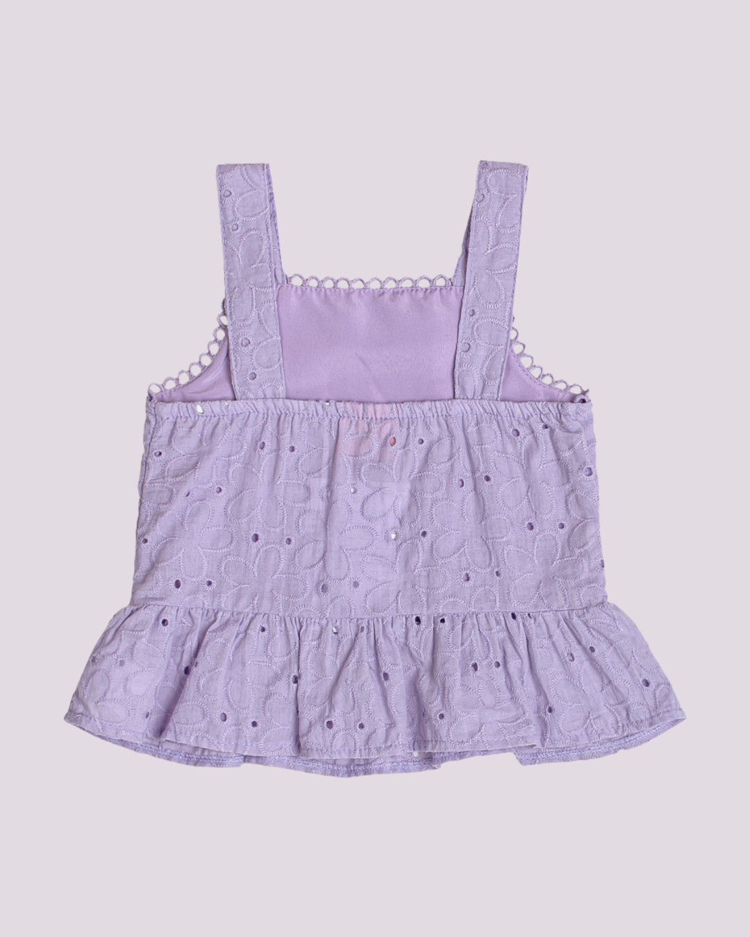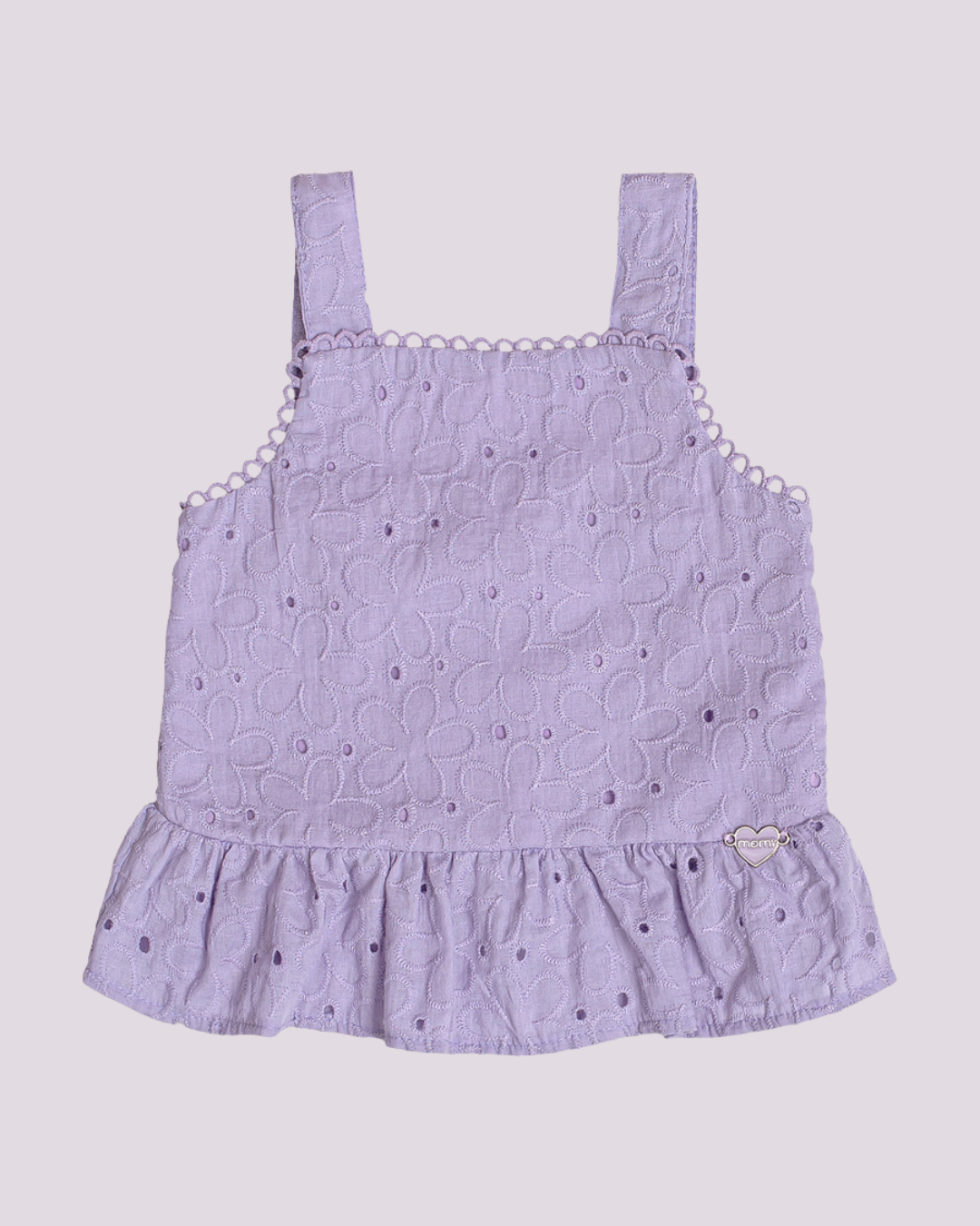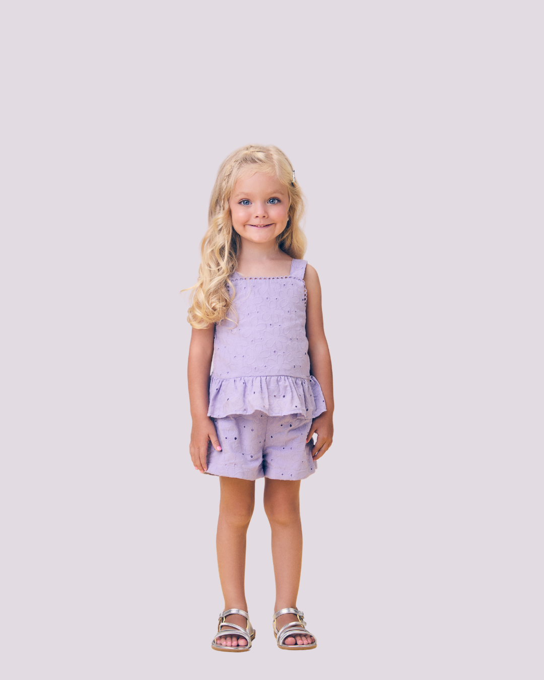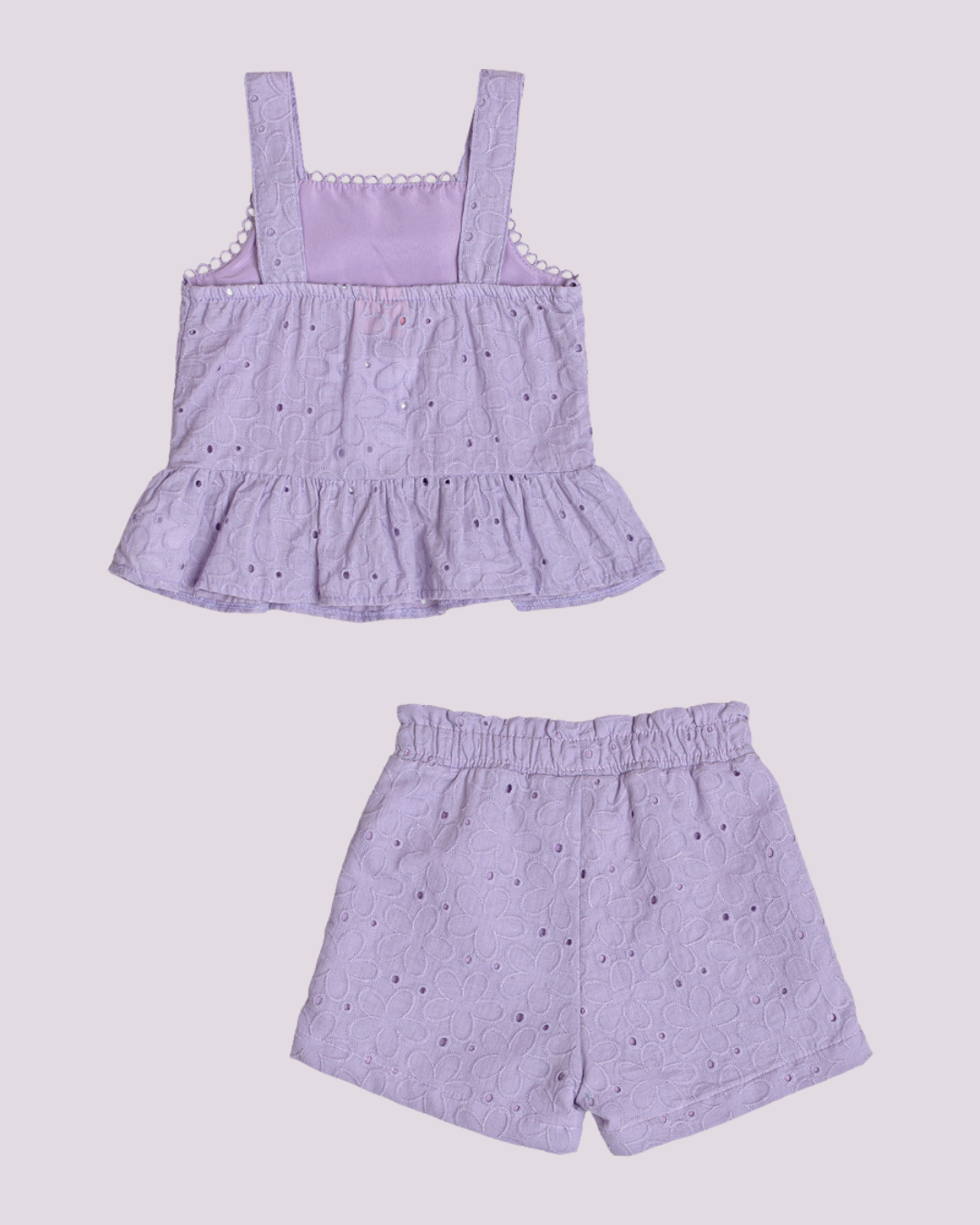 Conjunto infantil em laise lilás, composto por blusa de alças largas com babadinho na barra e detalhes delicados no acabamento, acompanhado de shorts com cós elástico e caimento soltinho. Um look fresco, moderno e cheio de charme para a estação.