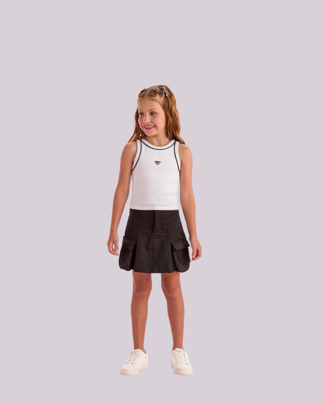 O conjunto Petit Cherry une estilo e conforto em uma proposta moderna e versátil. A blusa canelada branca com detalhes em preto traz um toque esportivo e contemporâneo, enquanto a saia preta com bolsos frontais e modelagem levemente evasê adiciona charme e praticidade. Ideal para composições casuais cheias de atitude, o look é perfeito para as pequenas que adoram se vestir bem sem abrir mão do conforto.