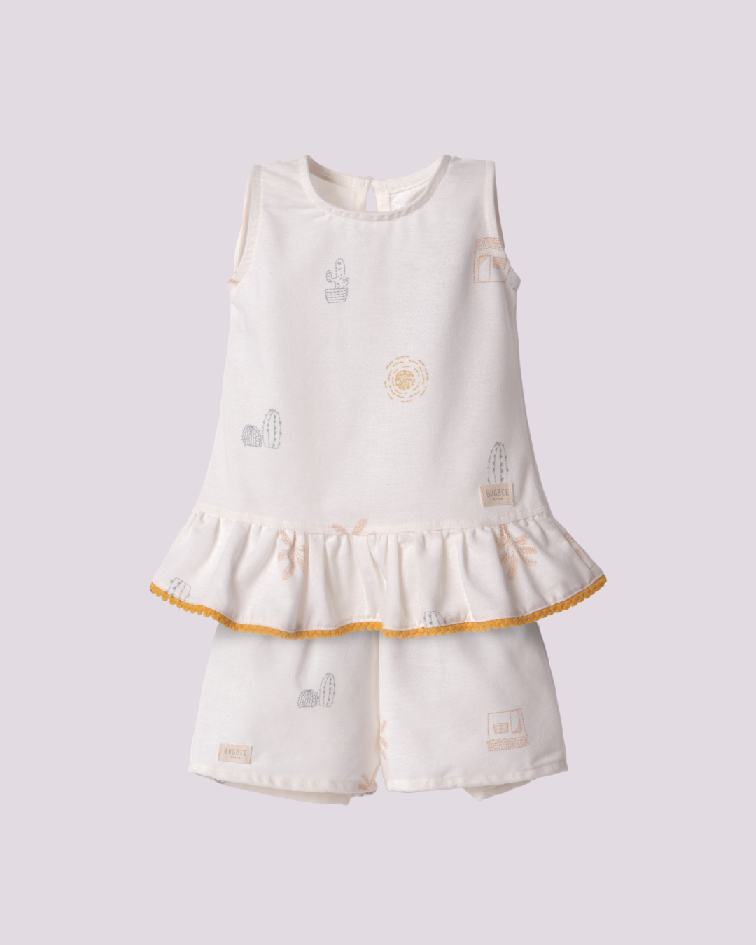 Conjunto infantil feminino Bugbee composto por blusa regata off-white com babado peplum e estampa delicada de elementos tropicais, acompanhada de short no mesmo tecido e estampa. O detalhe em barrado amarelo no babado traz um charme especial, deixando o look moderno e divertido. Ideal para passeios, viagens e dias ensolarados, oferecendo conforto e estilo.