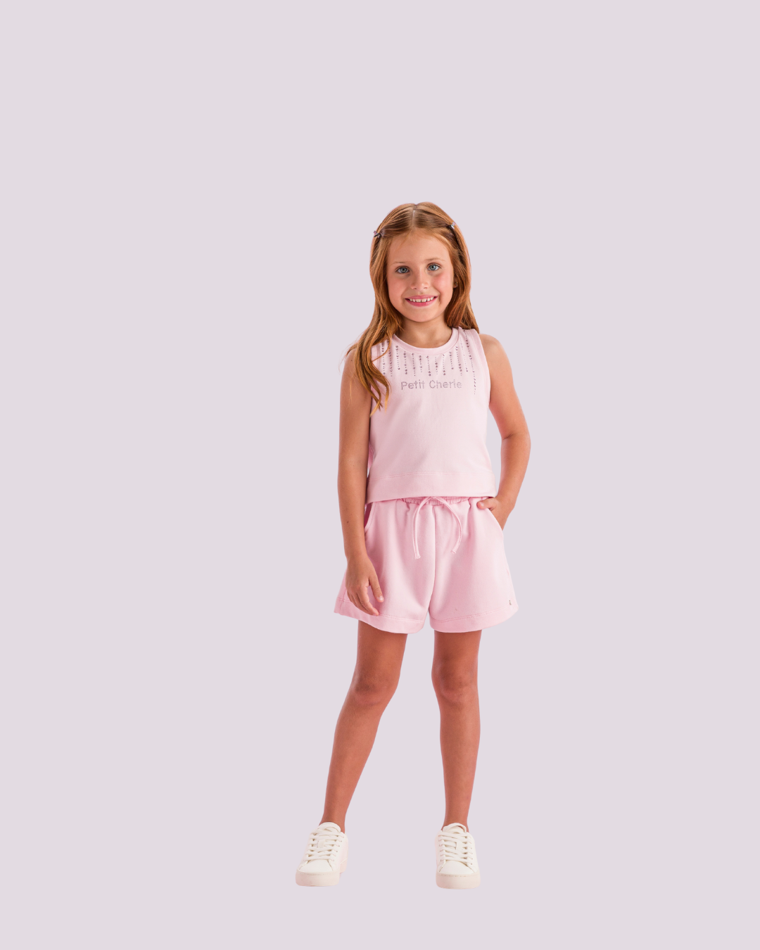 Conjunto Petit Cherie rosa em moletinho leve, com strass e amarração frontal, confortável e cheio de estilo.