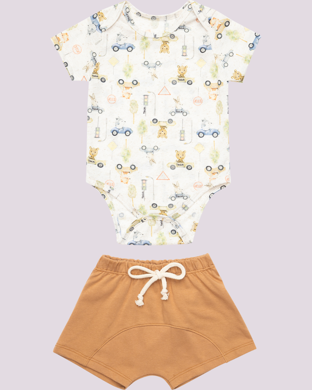 Conjunto Ursinhos na Estrada — conforto e fofura para acompanhar cada descoberta! Body com estampa de ursinhos dirigindo e short  com cordão, ideal para os primeiros passeios cheios de estilo e liberdade.
