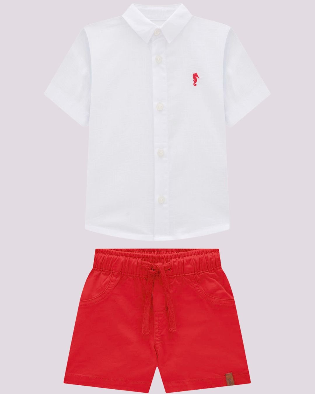 Conjunto infantil composto por camisa em linho leve e bermuda em sarja papelada, perfeito para compor looks confortáveis e elegantes. A camisa possui um design clássico com botões, enquanto a bermuda traz bolsos funcionais e cadarço ajustável para maior praticidade.