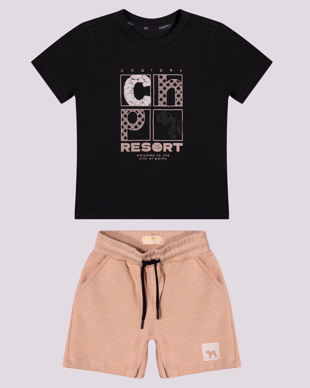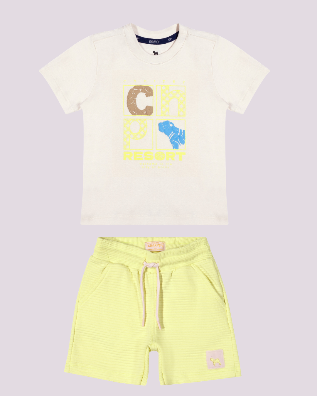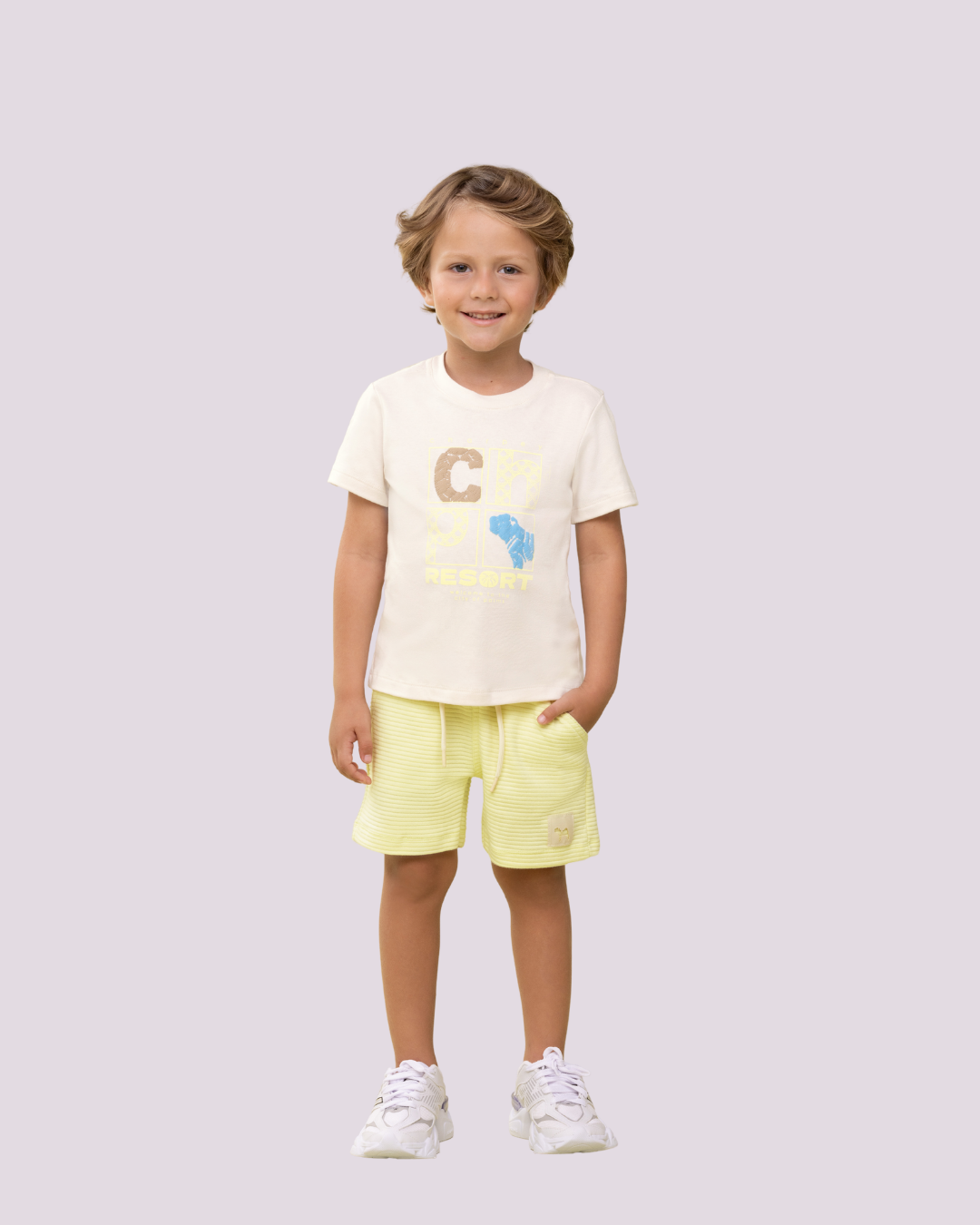 Conjunto Charpey com camiseta estampada e shorts amarelo — conforto e estilo em um look perfeito para o dia a dia dos pequenos.