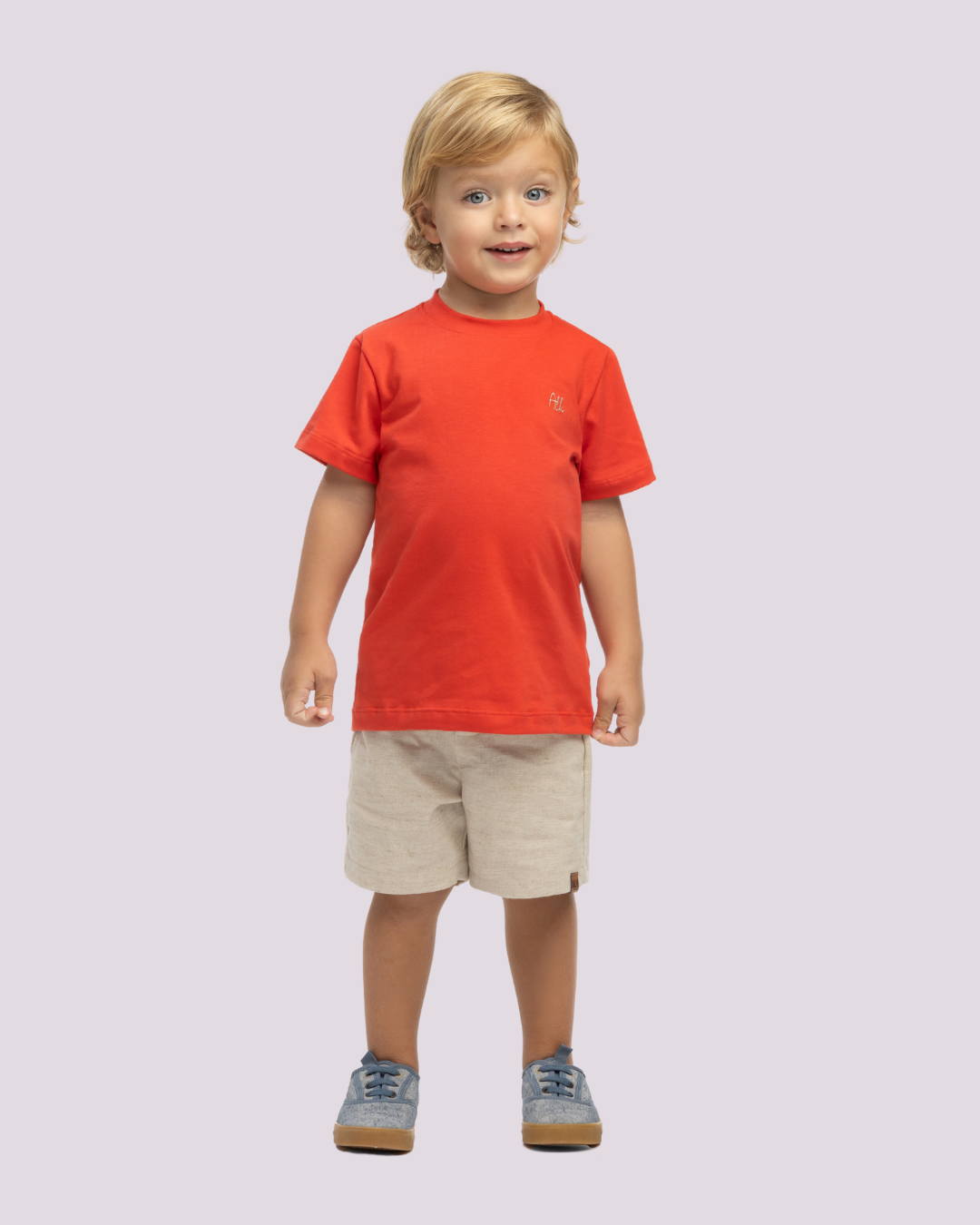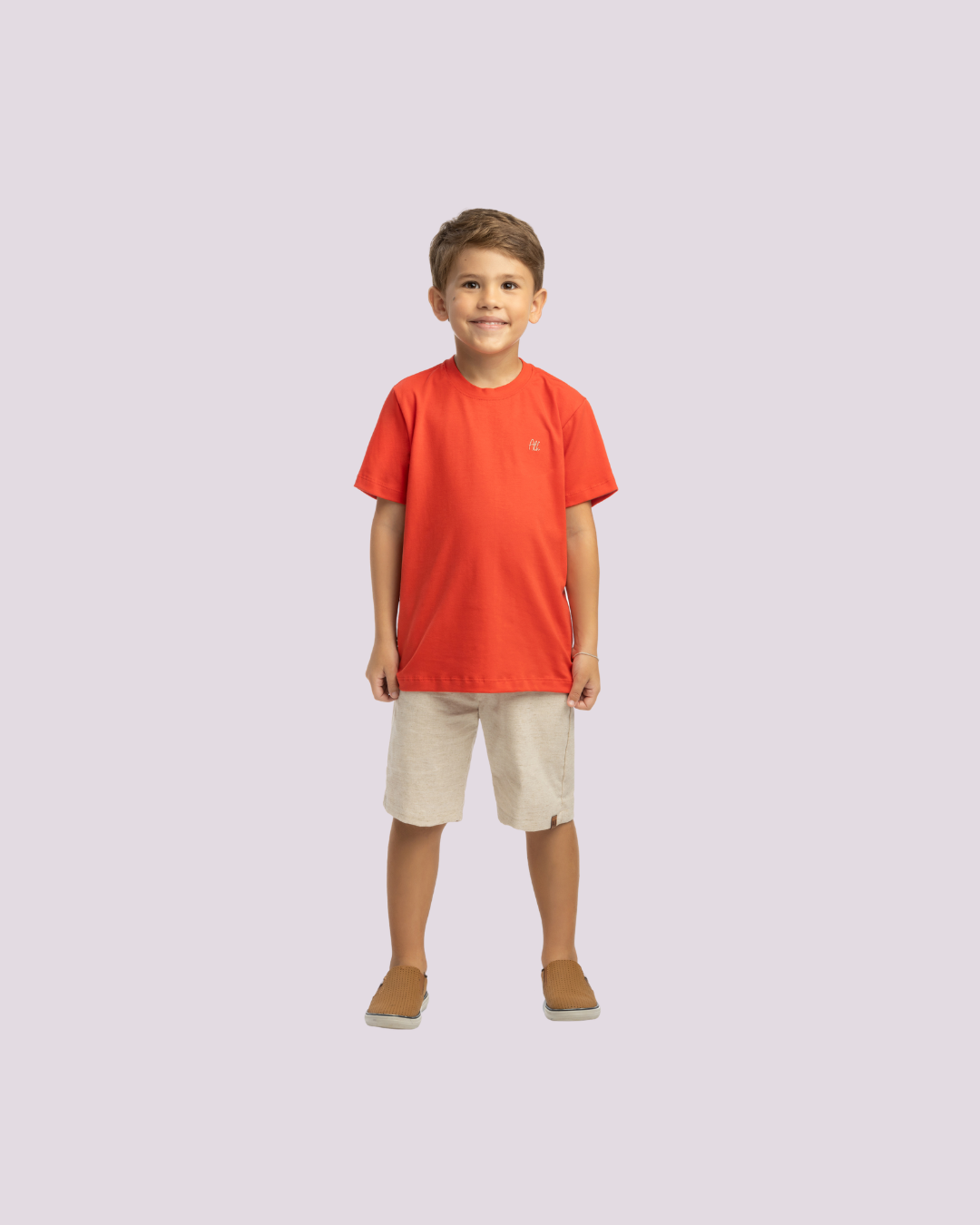 Conjunto casual composto por camiseta vermelha e bermuda neutra, pensado para garantir estilo e conforto durante o dia a dia dos pequenos.