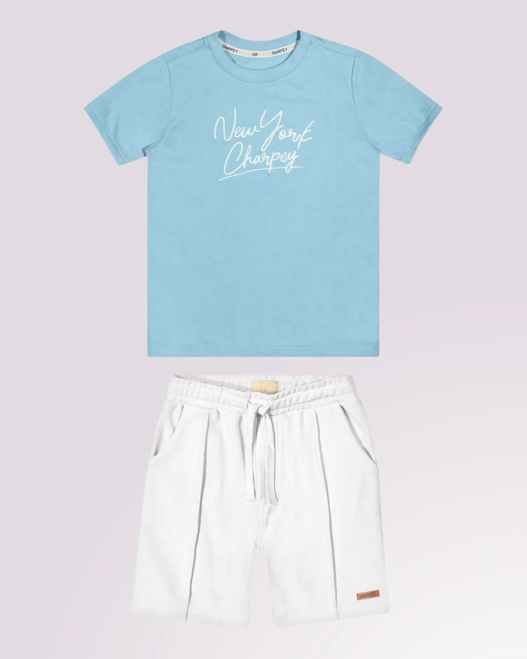 Conjunto Charpey azul e off white — conforto e estilo em um visual leve e sofisticado.