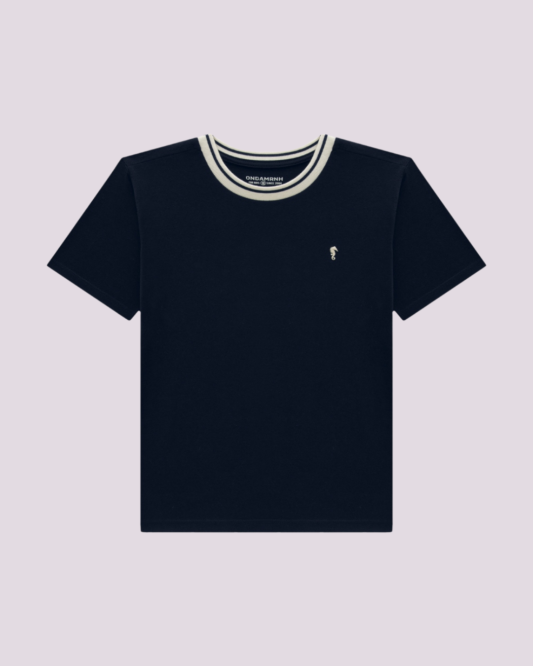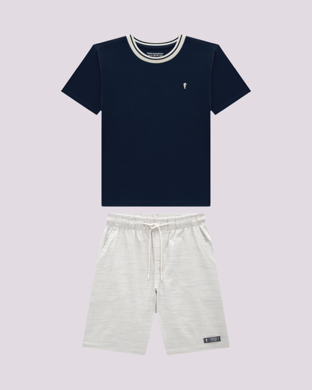 Conjunto infantil masculino com camiseta azul marinho de gola contrastante e bermuda clara, confortável e estiloso para o dia a dia