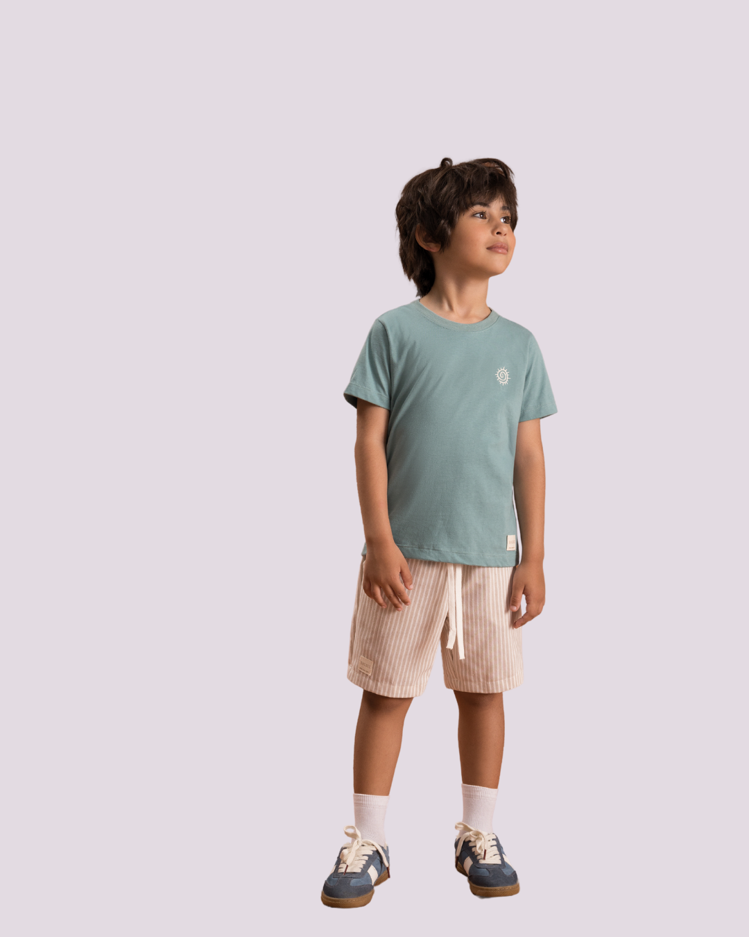 Conjunto infantil masculino composto por camiseta em malha verde com estampa discreta no peito e bermuda em tecido leve com listras em tom bege. A camiseta oferece conforto e praticidade, enquanto a bermuda com cós elástico e amarração garante ajuste ideal e liberdade de movimento. Um look moderno e versátil, perfeito para passeios e dias descontraídos.
