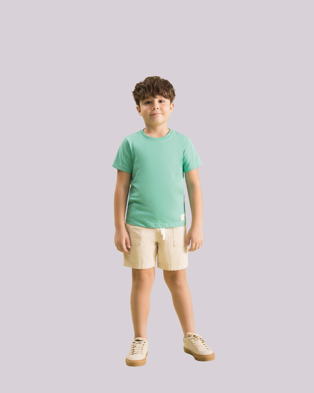 Conjunto confortável e moderno composto por camiseta verde menta e bermuda bege em moletinho leve. A camiseta possui modelagem clássica e toque macio, enquanto a bermuda conta com bolsos frontais e cós com cordão ajustável, garantindo praticidade e liberdade de movimento. Ideal para o dia a dia e momentos de lazer com muito estilo.