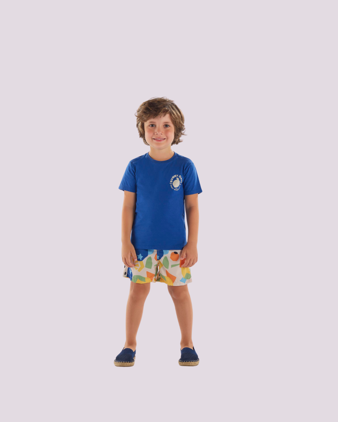 Cheio de energia e conforto, o conjunto traz camiseta azul com estampa divertida “Sunny Days” e bermuda estampada com shapes coloridos que remetem ao verão. Um look leve, moderno e cheio de personalidade — ideal para brincar, passear e curtir os dias mais quentes com estilo!