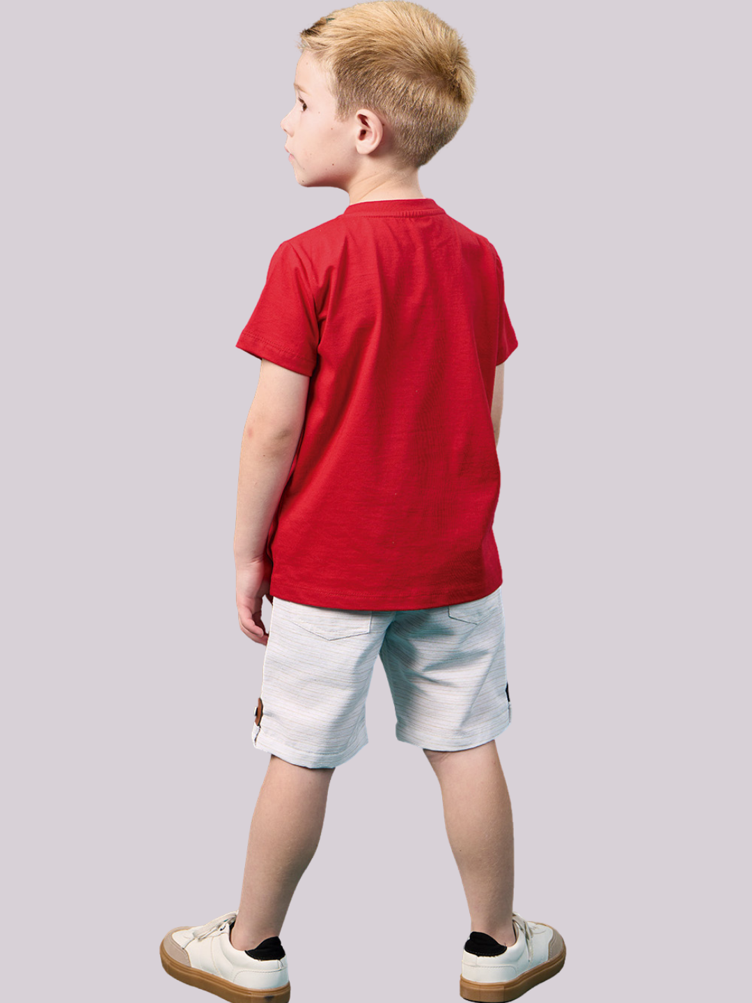 Conjunto confortável com camiseta vermelha e short branco, perfeito para passeios, escola e momentos de brincadeira com muito estilo.