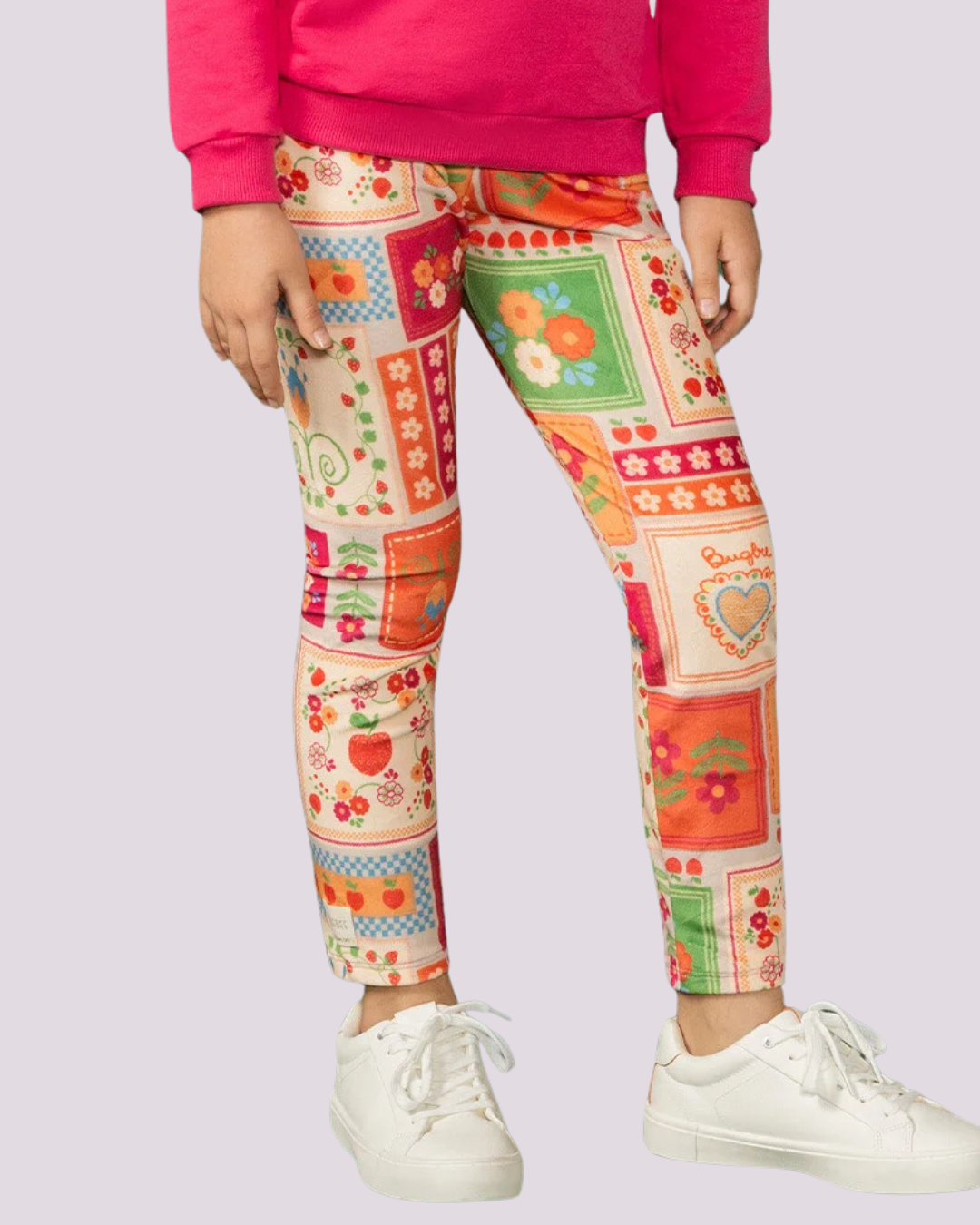 Look vibrante e cheio de charme com blusa em moletom pink com detalhe de coração bordado e legging colorida com estampa divertida. Perfeito para dias de alegria e conforto!
