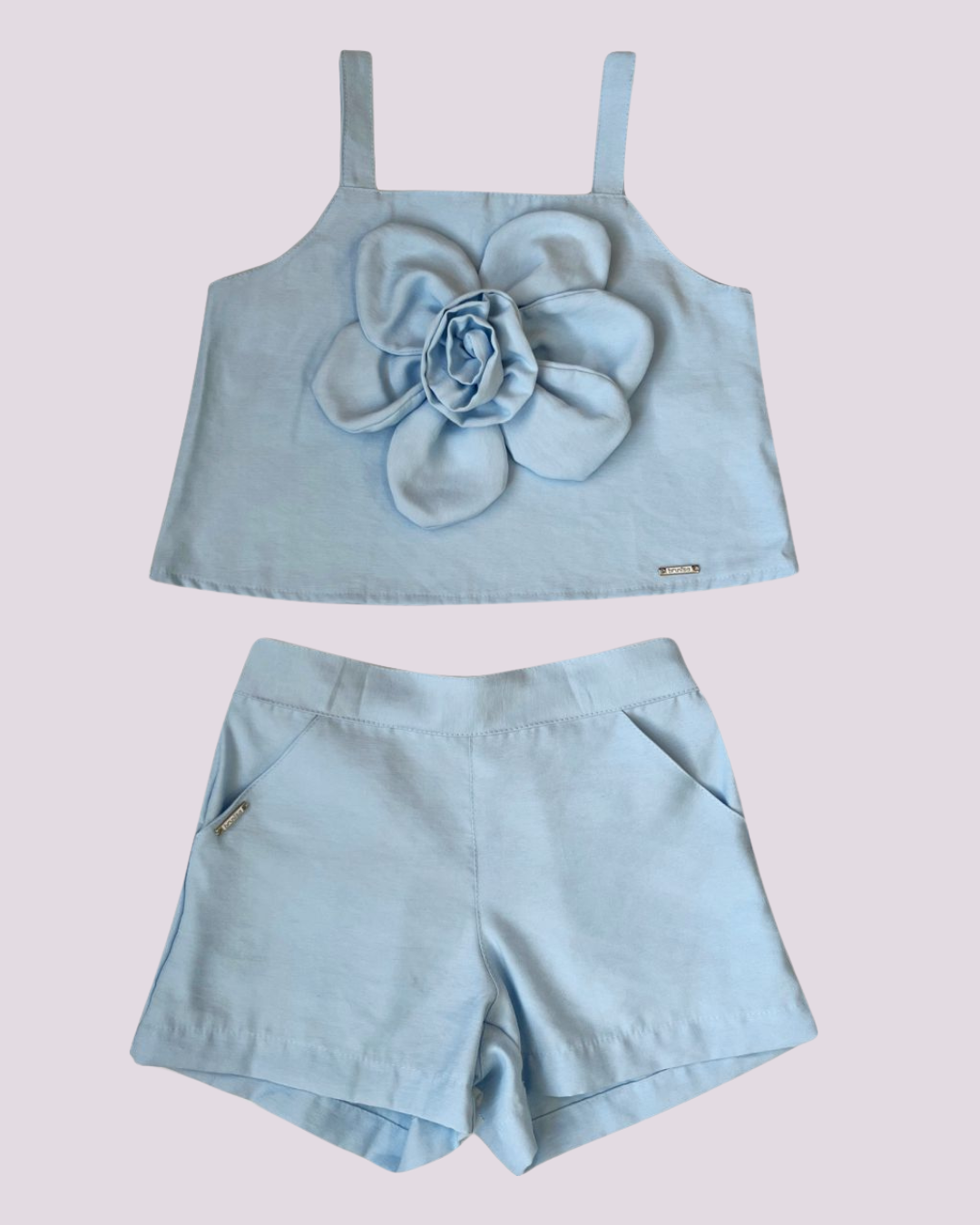 Conjunto infantil delicado e elegante, composto por blusa de alças finas e short em tom azul claro. A blusa se destaca pela aplicação de flor grande em tecido no centro, que traz charme e sofisticação ao look. O short possui modelagem confortável, com bolsos laterais e acabamento impecável, ideal para garantir liberdade de movimento. Confeccionado em tecido leve e macio, é perfeito para ocasiões especiais ou passeios, unindo estilo e conforto.