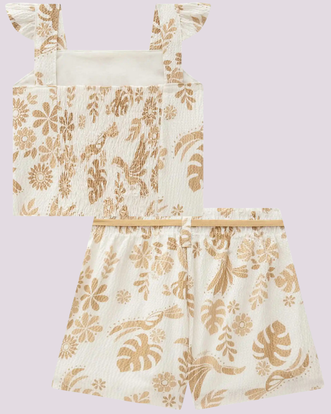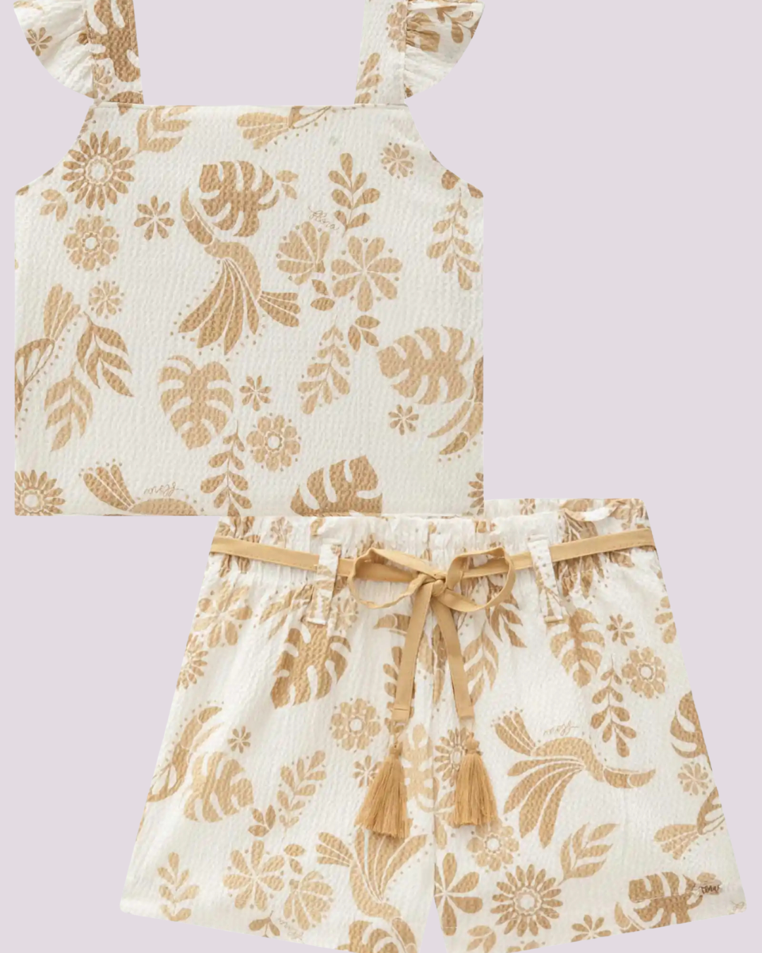 Conjunto infantil leve e sofisticado composto por blusa com estampa floral dourada e babadinhos nos ombros, combinada com shorts no mesmo padrão, com elástico e amarração ajustável na cintura. O tecido texturizado e o brilho sutil conferem um toque elegante, ideal para momentos especiais ou passeios nos dias quentes.
