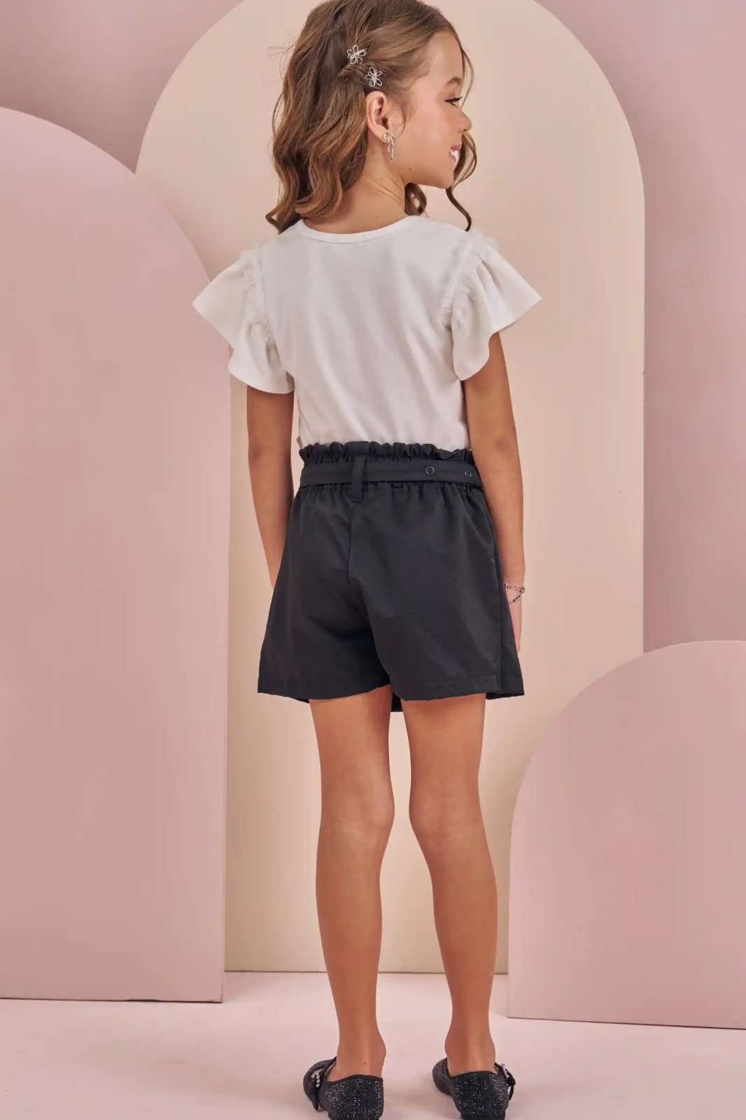 Conjunto infantil com t-shirt estampada e saia preta com detalhe em coração, unindo conforto, delicadeza e estilo.