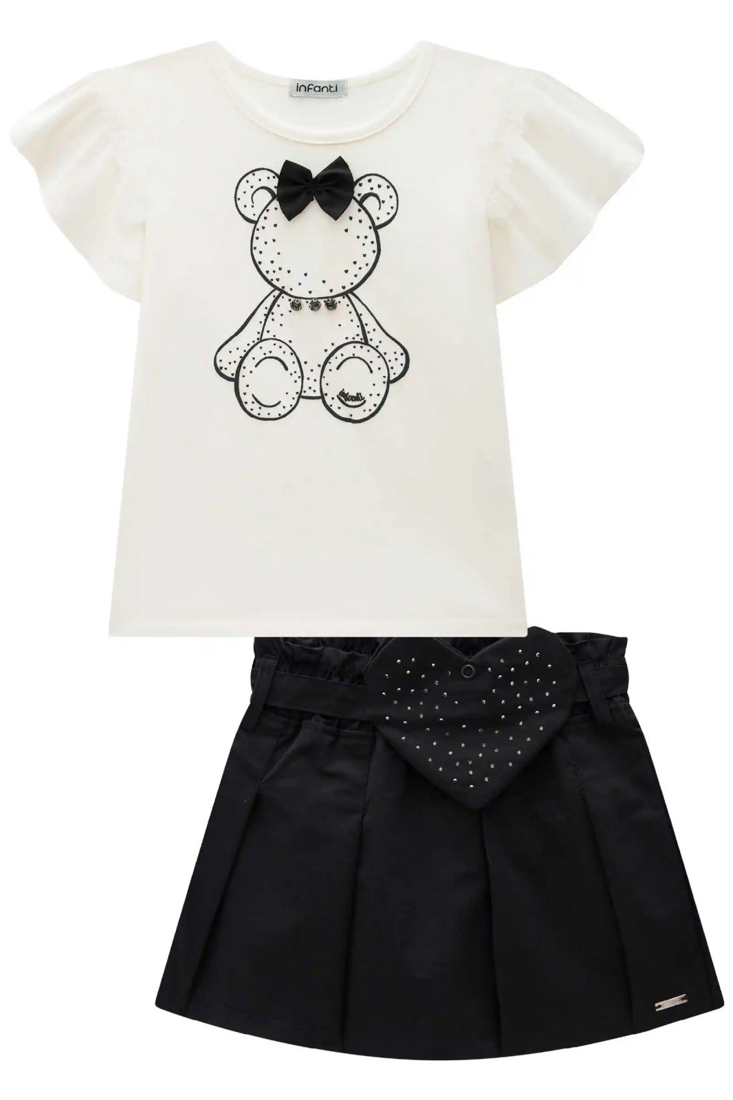 Conjunto infantil composto por t-shirt branca com estampa de ursinho em aplicação delicada e laço preto, trazendo charme e suavidade ao look. A saia preta tem modelagem confortável e detalhe frontal em formato de coração com aplicação de strass, deixando a peça moderna e elegante. Ideal para ocasiões especiais ou para um visual casual cheio de estilo.