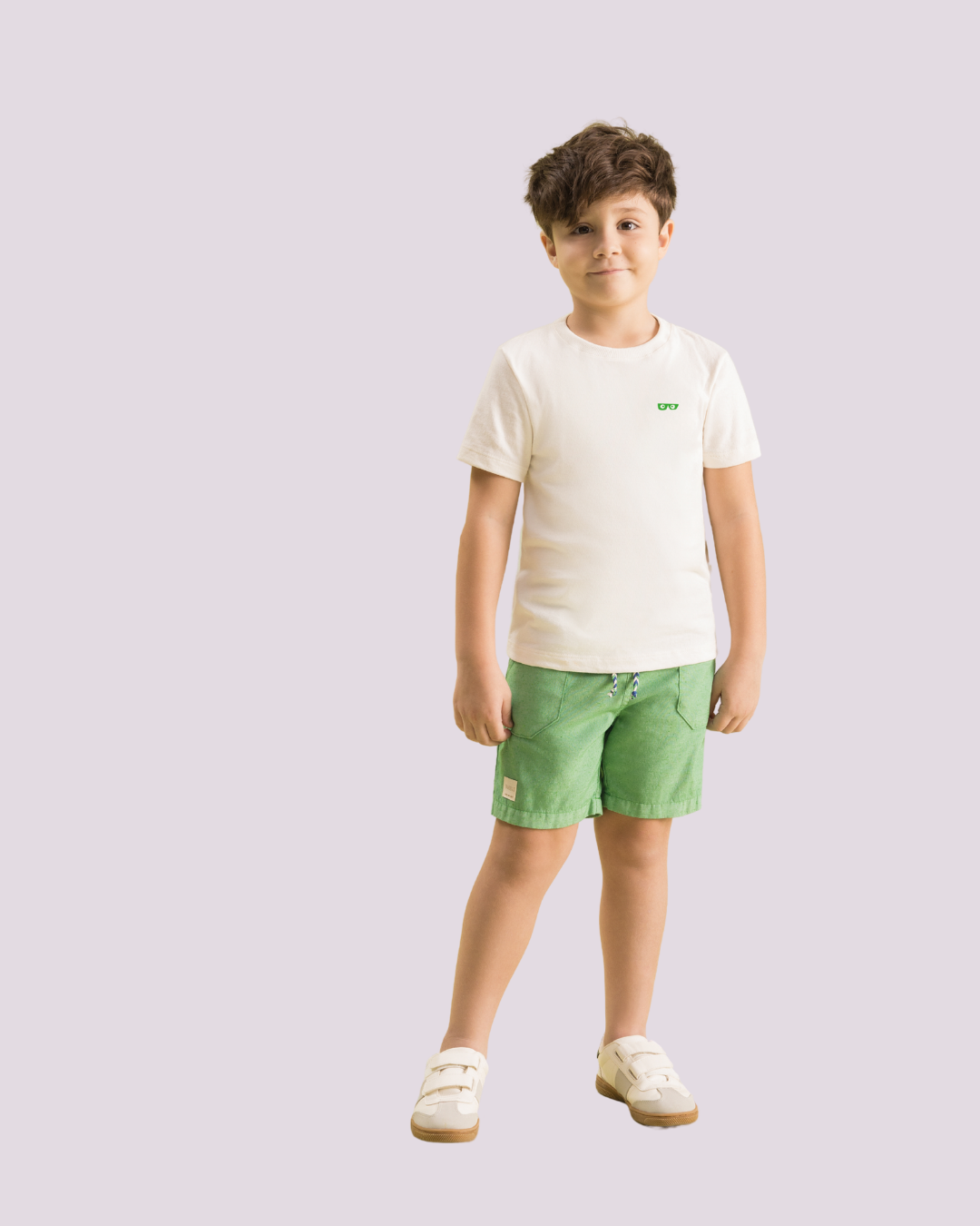Conjunto infantil masculino composto por camiseta em malha off-white com detalhe bordado discreto e bermuda em tecido leve na cor verde. A combinação é confortável, moderna e cheia de frescor, ideal para dias de calor. O design minimalista da camiseta se une ao toque divertido e vibrante da bermuda, criando um look versátil para passeios, encontros em família e momentos de lazer.