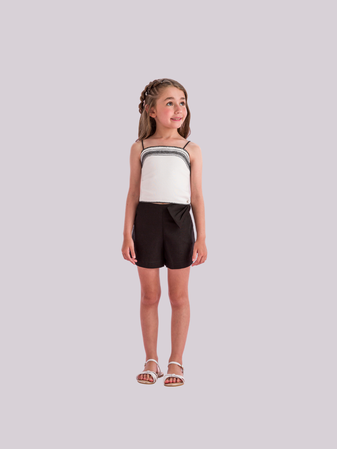 Conjunto infantil com blusa branca de alças finas e short preto com laço lateral, perfeito para um look moderno e confortável.