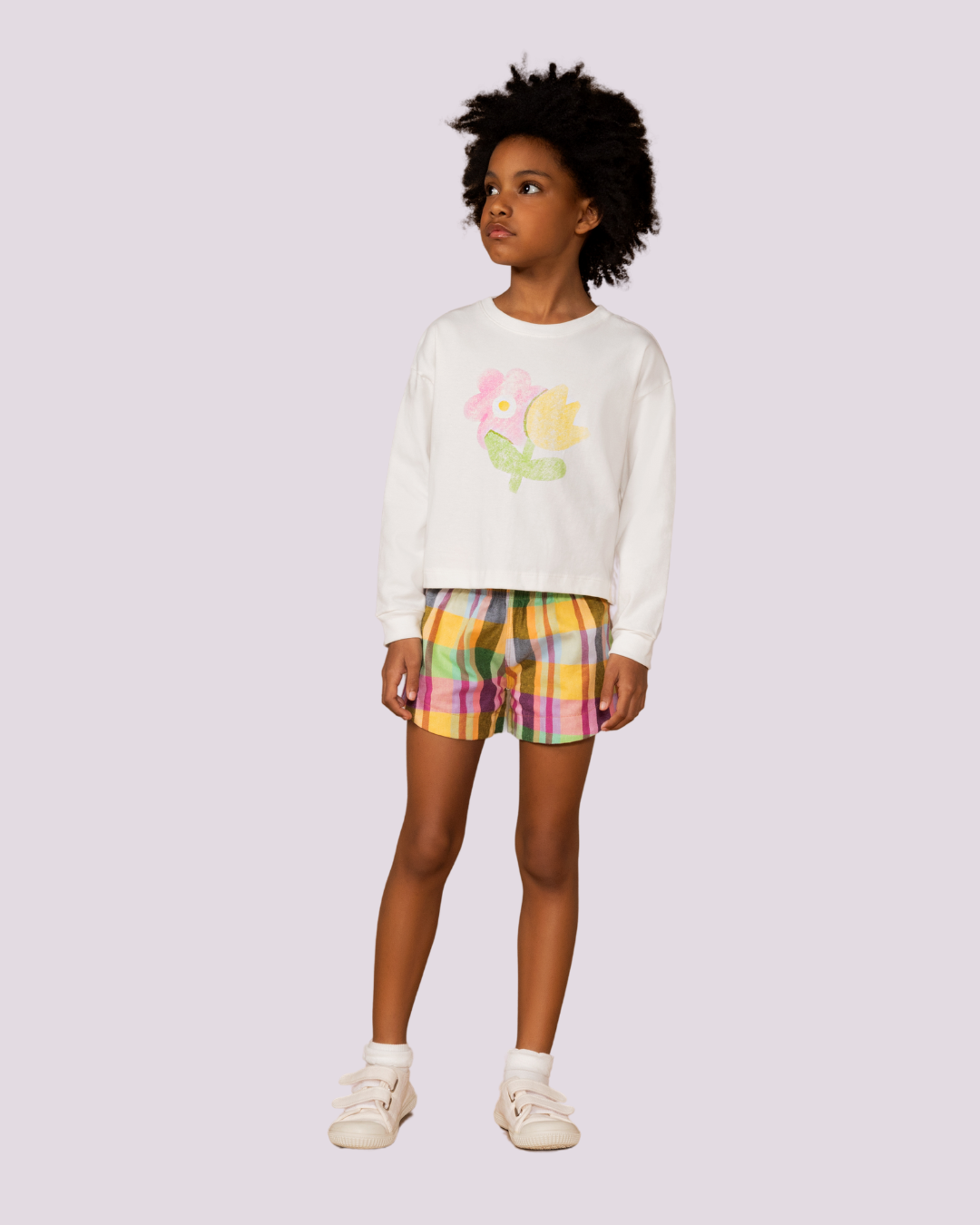 Conjunto Bugbee com blusa em malha leve e shorts em tecido plano 100% algodão responsável. Um look fresquinho, colorido e cheio de charme para os dias ensolarados com consciência e conforto.